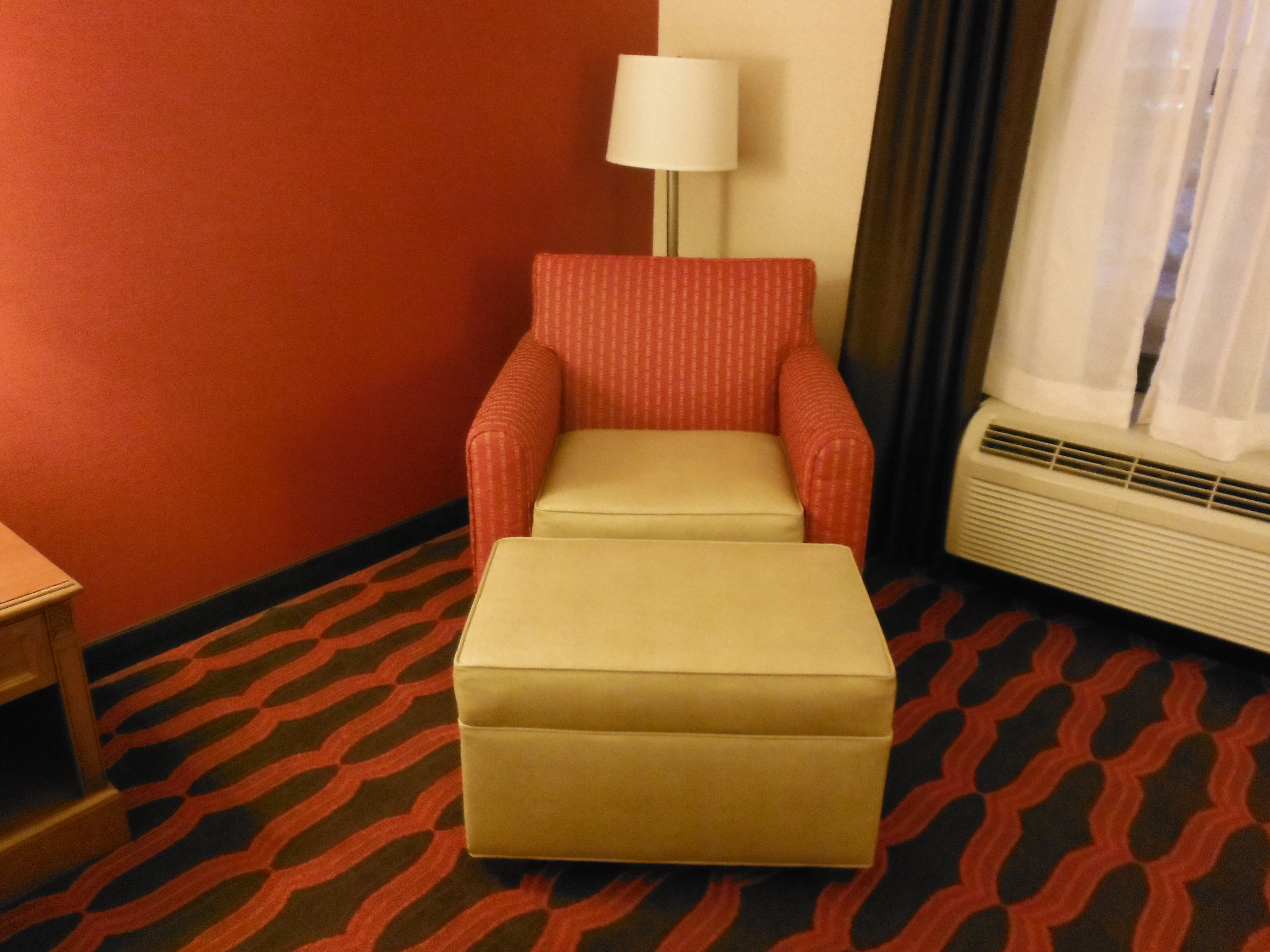 Now onto the room. I had booked a king non-smoking room and that’s exactly what I got. It was very clean and pretty spacious. I had a king bed, a work desk and a side chair with ottoman. Again the floor was pretty interesting, with this really cool red and black patterned carpet, the colors of the room made it feel modern and warm, and made me feel comfortable. Speaking of comfortable the bed and pillows kicked butt. Hampton offers 2 or 3 different pillow options, so I can always find just the right one. The HD TV and work desk are a nice add on, although I didn’t need the work desk this time. As for the bathroom, I really don’t ask for much. Just a bathroom that’s big enough to stand in and not touch any of the walls, counter space larger than the sink so you can actually store stuff, hot water and quite pipes. Again it was not a fancy bathroom, but it was clean and fit my needs thanks again Hampton.