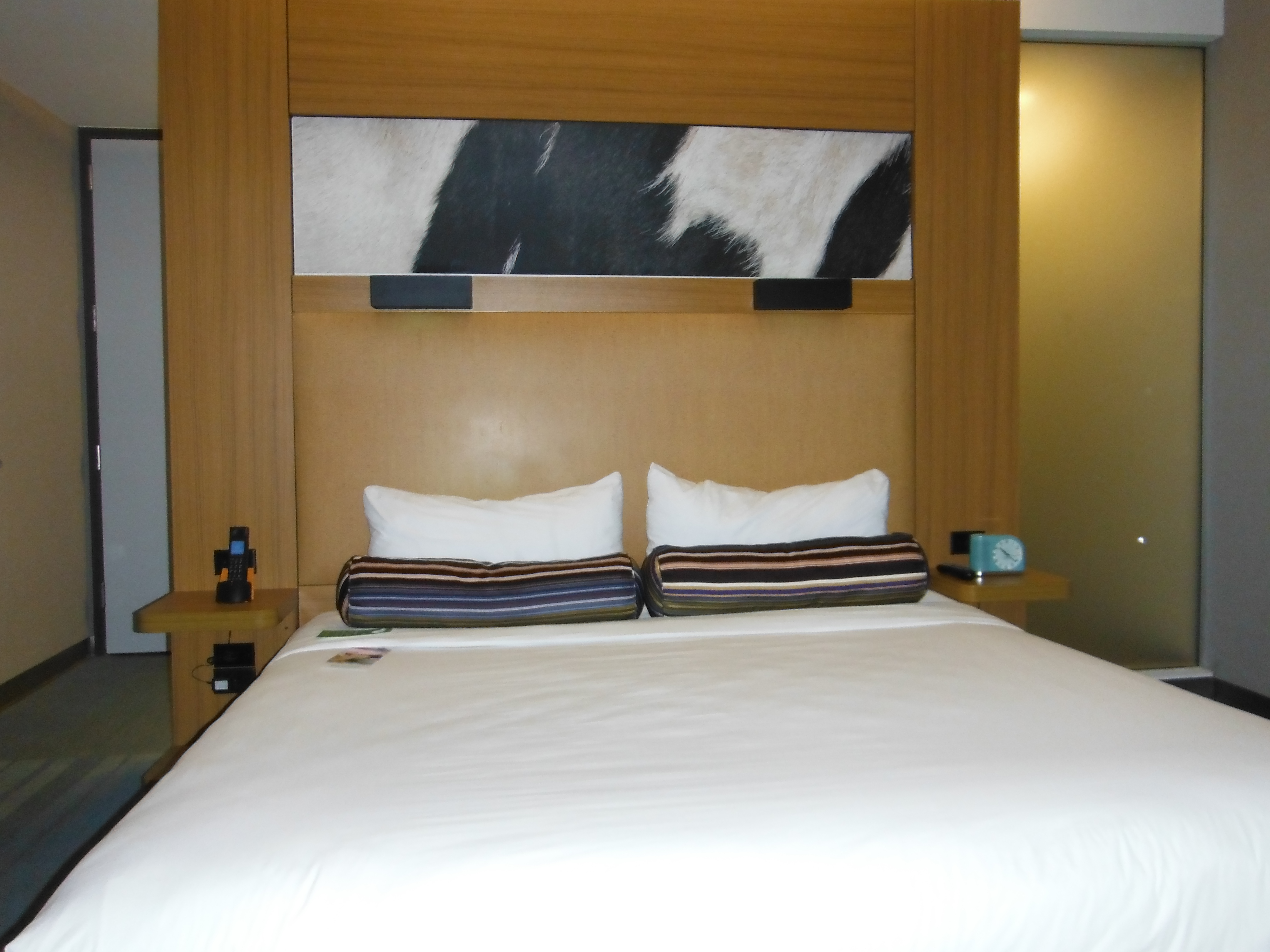 The room it’s self you guessed it is inspired by a loft. It’s one open space room with a ¾ wall separating the bathroom, and vanity from the rest of the room. It’s not Spartan and it’s not fancy, just right I’d say, for a hotel room, that’s trying not to be a hotel room. The bed was comfortable, it had tons of power plugs and it had a little media center that had USB, HDMI, VGA , power and a few other hook ups. It was a cool thing. I was not fancy but was not to hip to make me feel out of place, since I am so unhip.