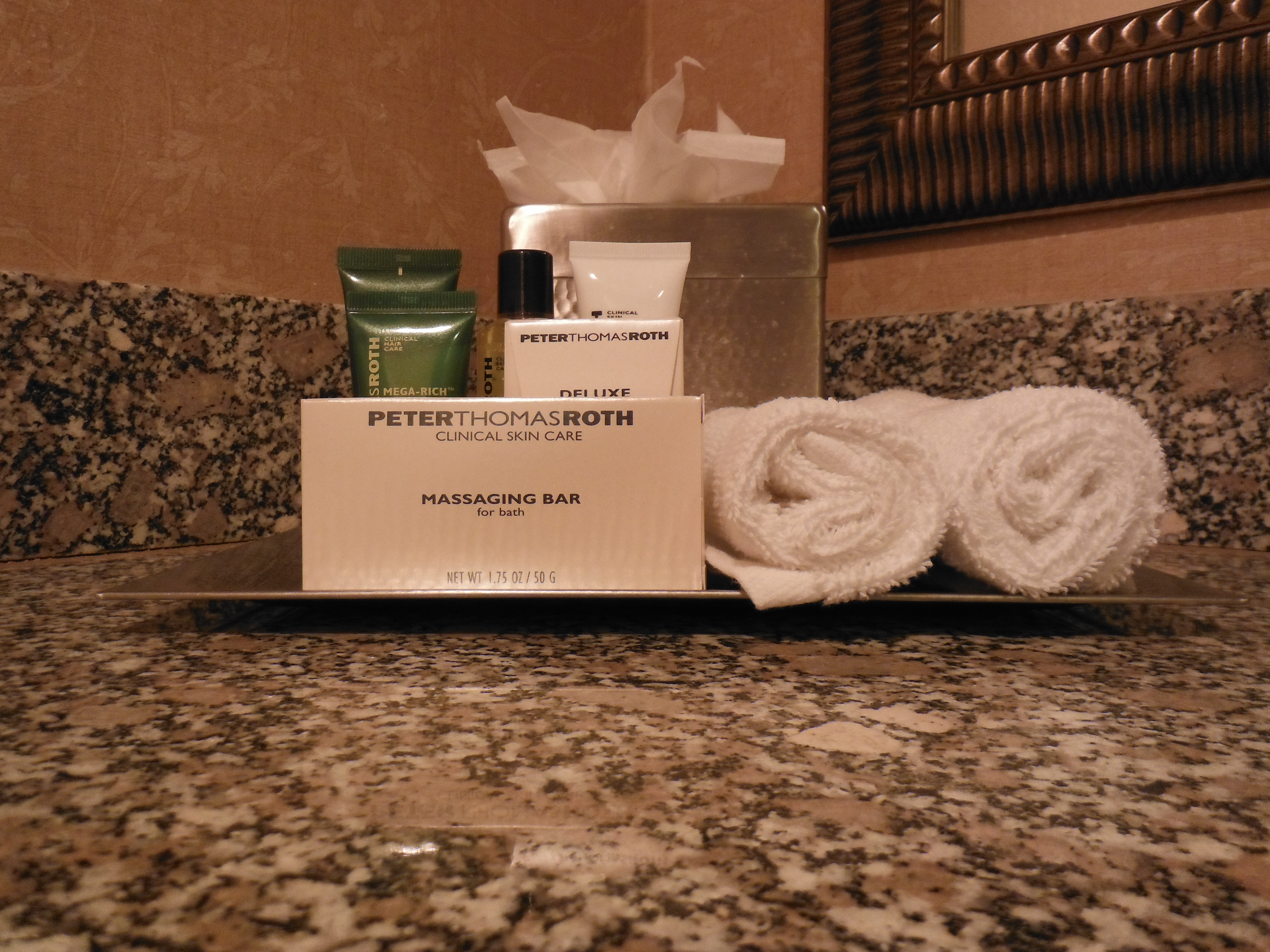 Apparently I was also upgraded to a balcony room (thank you status), since I’ve never stayed at this hotel before, I really don’t know if the room was any different than the standard, but hey I got a balcony. It looked like there were only two of these per floor, so I scored. It had a comfortable bed with plenty of soft pillows, a really nice desk/ media center as well as a modern well-kept bathroom. The desk and media center had really great storage cubes, and a decent sized desk. Plus below each end table were additional leather seating cubes, nice touch if you wanted to entertain.