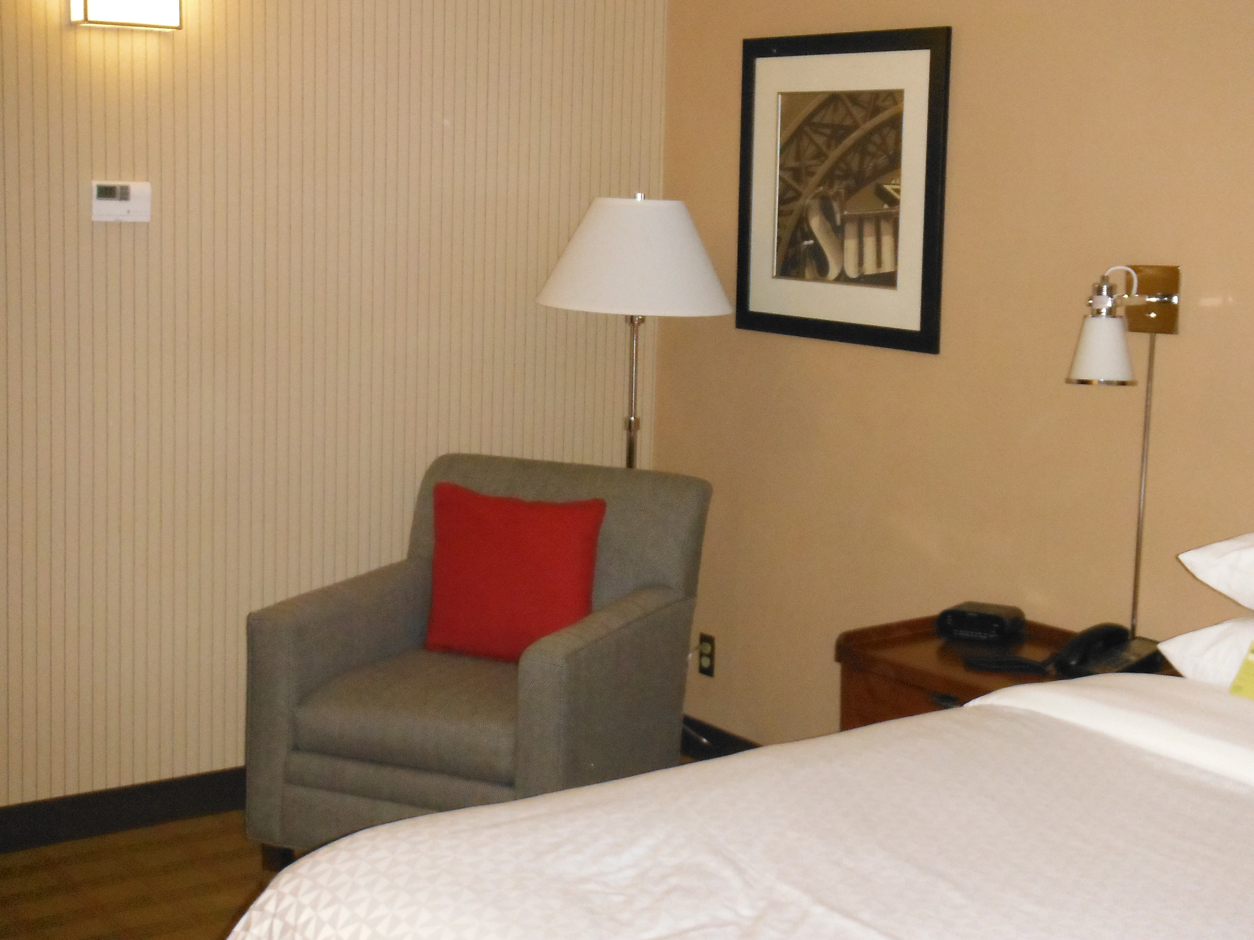 The Aloft was my favorite hotel and was in the good category for sure. What did I like about it, I think it was because it was different and my first time at this brand. How I understand it, is that this hotel is inspired by the W brand, another hotel, I have not tried. It’s like the younger sibling of W. So it exudes hip and coolness (is that even a word). You walk into this sleek hotel with plush seating thoughout the expansive lobby, a trendy lobby bar, pool table, fireplace and lots of alcoves to hang out. On both nights the lobby was packed with people having a drink and socializing, and on Thursday nightd they even had a live band. It was an interesting atmosphere and even though I didn’t partake in the fun it looked like it would be nice place to hang out. As for food options, they offered room service for breakfast made in the hotel and for lunch and dinner they had room service provided by a British Pub located in the same shopping center. I did eat the breakfast, and it was not bad. They had lots of fruit, muffins, yoghurts and made to order breakfast sandwiches and burritos.