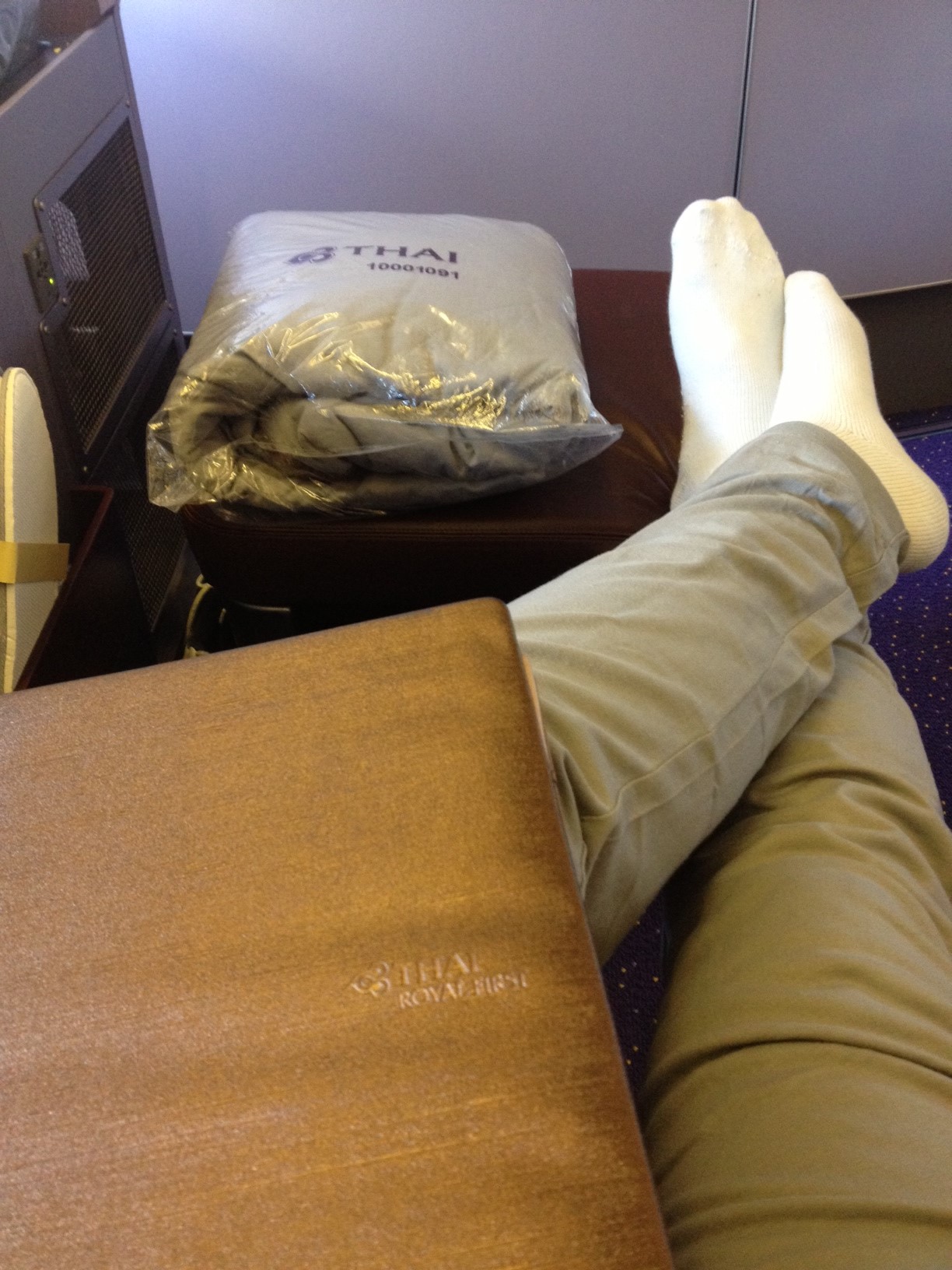 I left Sydney late in the afternoon, on one of the two 747’s that fly from and to Sydney and Bangkok on Thai every day. On this sector and the one to Japan I had used miles to score a first class seat, I was truly giddy as a school girl because I had never flown Thai let alone in first and was looking forward to the hopefully amazing experience. In a nutshell, I was not disappointed in a cabin of ten maximum passengers and four crew members you knew you were in for a treat. Even though the cabin was full, it never felt crowded and I always felt attended to when I needed anything. In fact upon arrival on the plane, I was greeted by name, taken to my seat and then all four attendants came by to introduce themselves. Even at disembarkation, they all went by each passenger, and said thank you and bowed. As I’ve found so frequently thought out Southeast Asia so many people are so friendly even on an airplane.