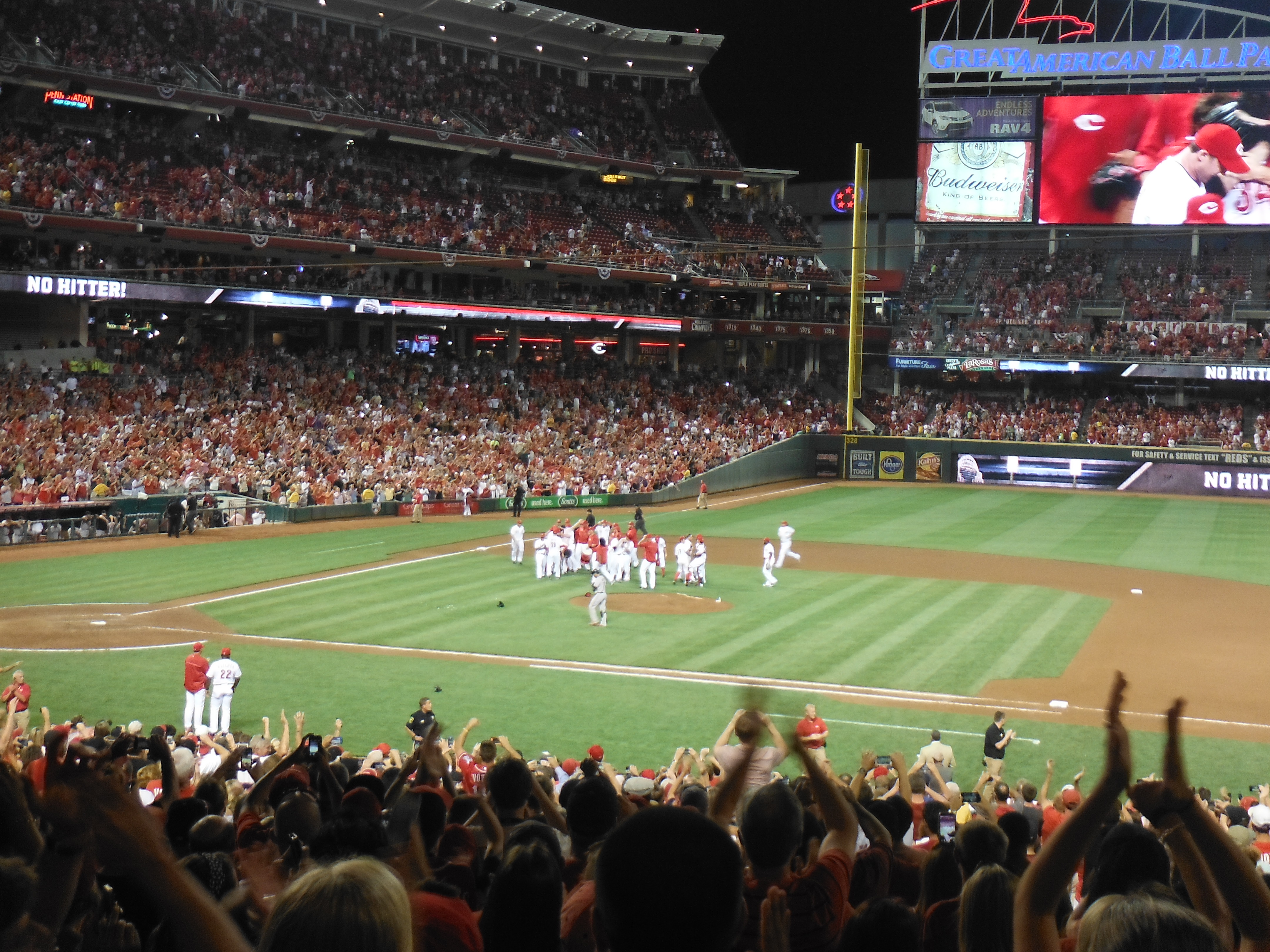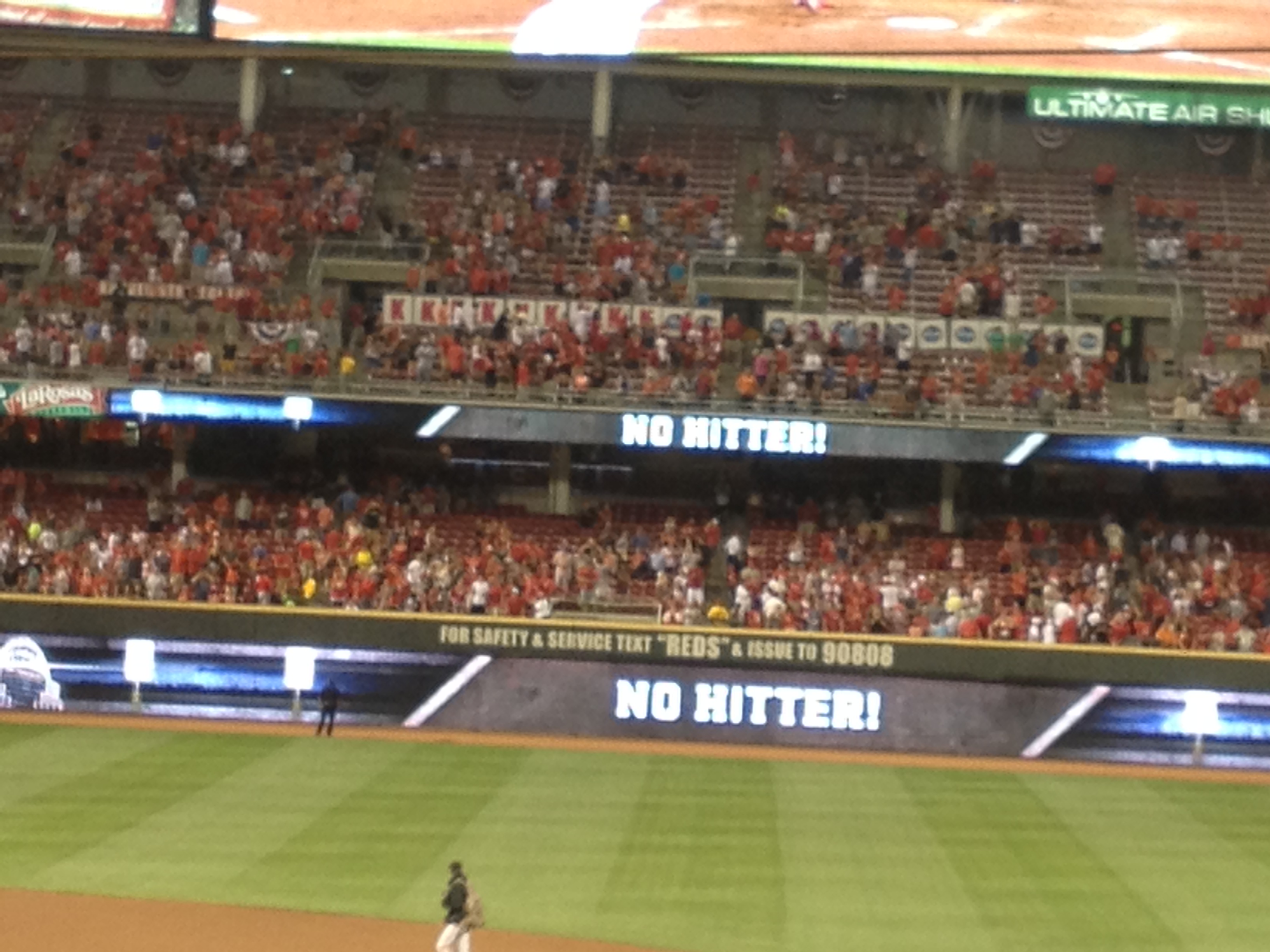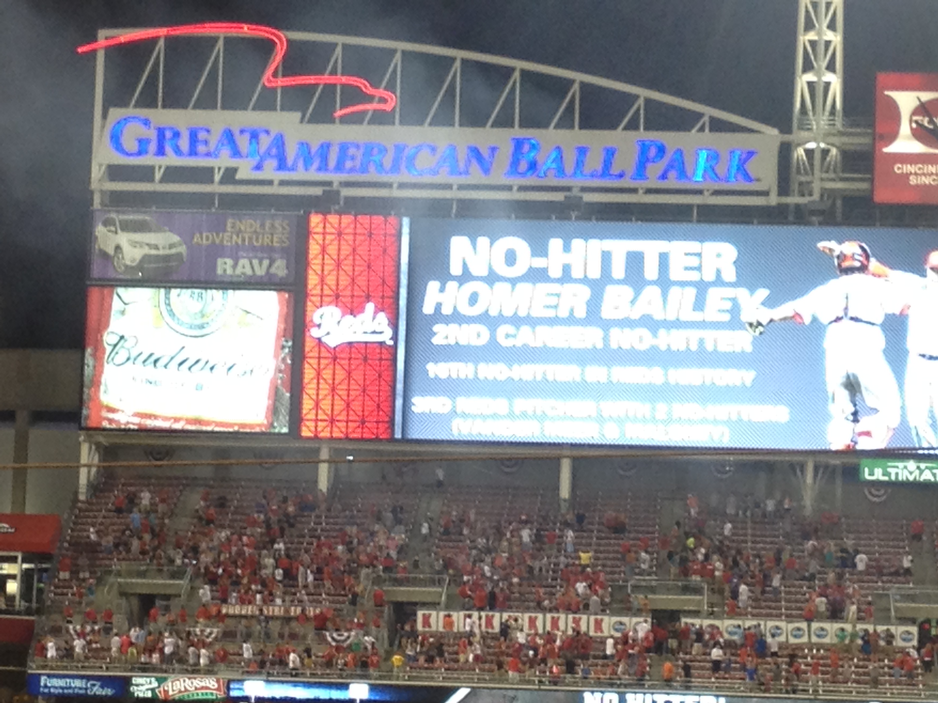 Anyhow, by the fifth inning I was thinking we were looking at something special. Baily was efficient on the field he had a few strike outs and was managing to keep a sad line up from making any contact with the ball. By the sixth, the Reds fans around us, “T” and I thought of the almost impossible A Perfect Game. By the seventh the stadium was electric; with every out the fans were going crazy. I was saying everything you would normally not talk about during A Perfect Game. If you’re a baseball fan you know what I mean. This was the Reds for crying out loud, if it was the Giants throwing this amazing game, I would never ever ever say Perfect Game or No Hitter. Alas in the seventh Bailey gave up a walk, the fans were still cheering but we were all a bit sad that the Perfect Game was not intact. Just in case I have a few readers that don’t know the difference between a Perfect Game and No Hitter.Alas in the seventh Bailey gave up a walk, the fans were still cheering but we were all a bit sad that the Perfect Game was not intact. Just in case I have a few readers that don’t know the difference between a Perfect Game and No Hitter. A PG is not allowing any batter to reach base in any fashion. There are 27 outs, so that means recording all 27 out’s by strike out, fly out or ground ball. In the history of Baseball there have only been 27 PG’s. A NH is when a batter reached based either by walking, error or hit by pitch. In other words, not getting a hit, but still allowing a runner to reach base. In the 100 plus years of baseball there have been 327 No Hitters. In that span there have been roughly 200,000 regular season games. So seeing a No No is incredibly special. I personally only know four people besides myself that have seen one in person. I know I’m geeking out here, but what can I say. I never thought I’d get to see one and I’m just tickled pink that I got to check off another bucket list item.