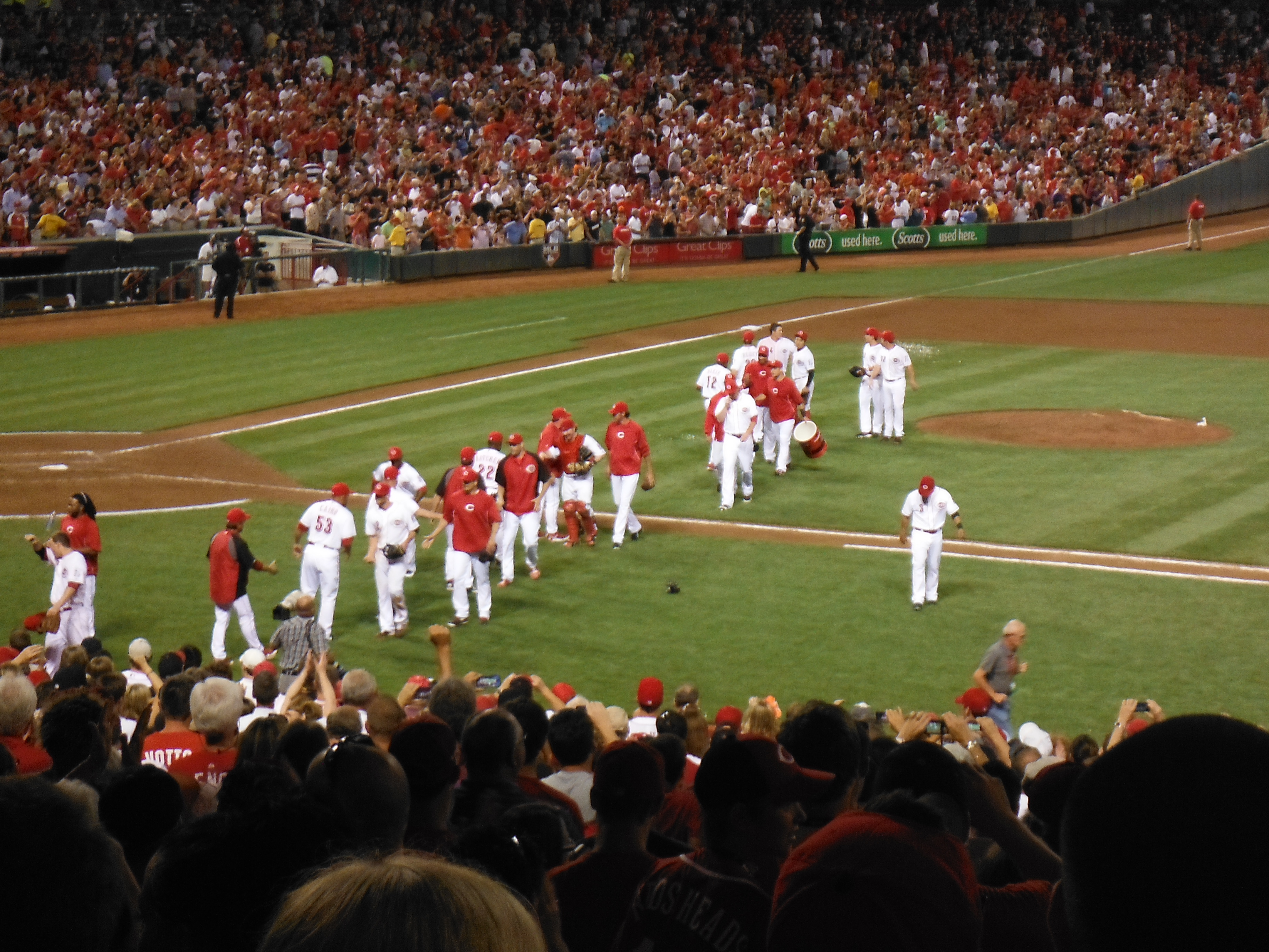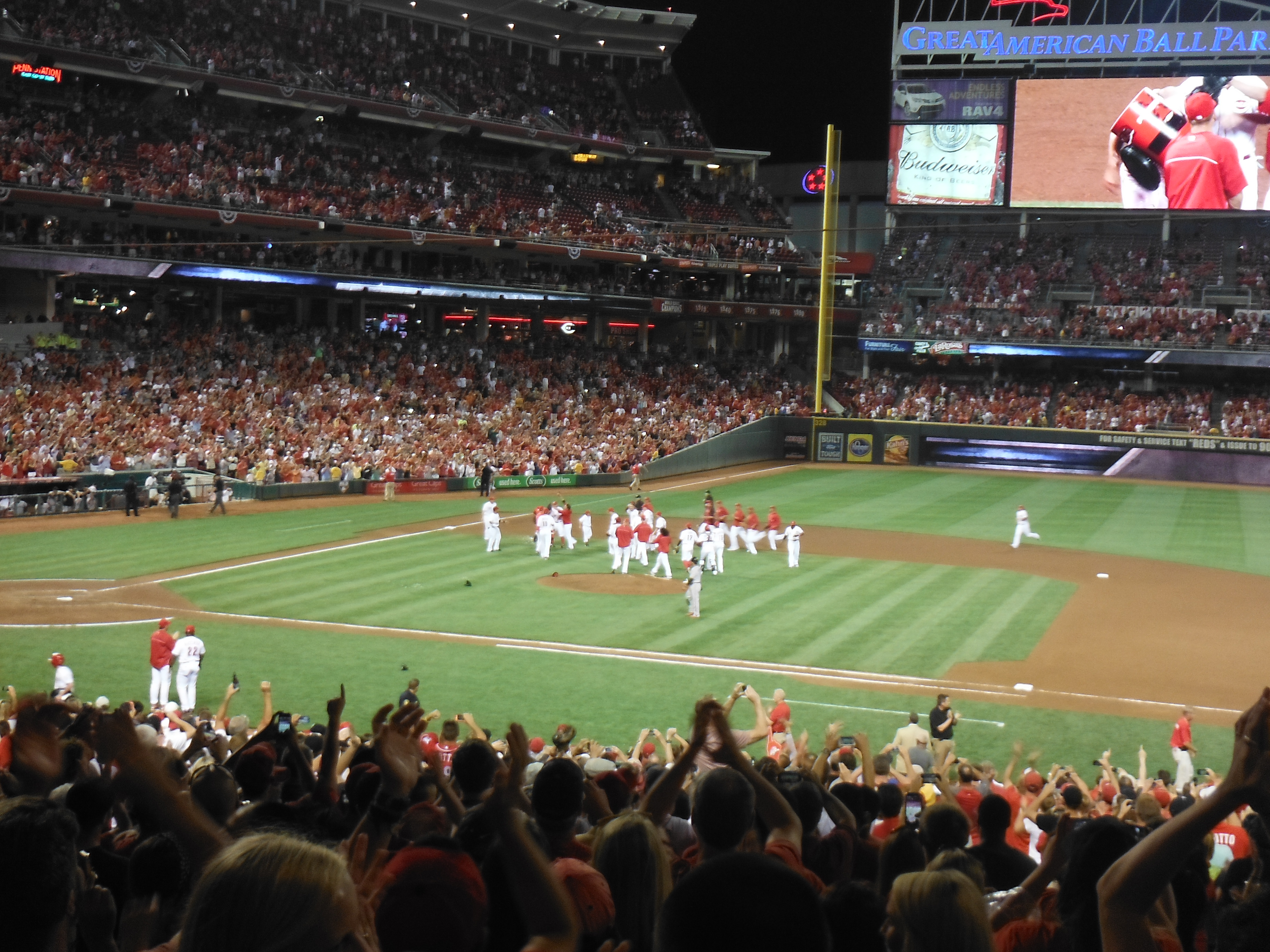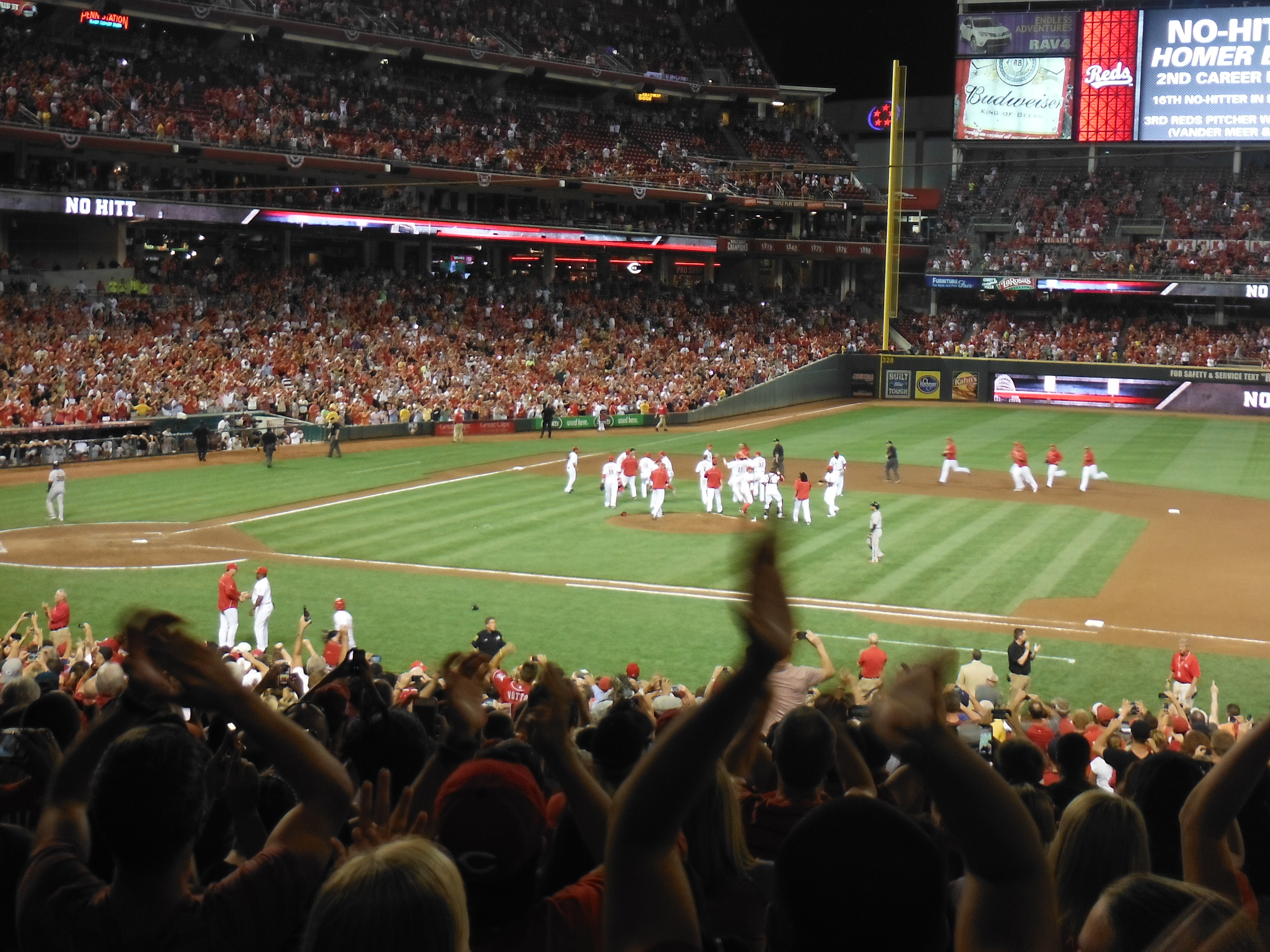 Anyhow, by the fifth inning I was thinking we were looking at something special. Baily was efficient on the field he had a few strike outs and was managing to keep a sad line up from making any contact with the ball. By the sixth, the Reds fans around us, “T” and I thought of the almost impossible A Perfect Game. By the seventh the stadium was electric; with every out the fans were going crazy. I was saying everything you would normally not talk about during A Perfect Game. If you’re a baseball fan you know what I mean. This was the Reds for crying out loud, if it was the Giants throwing this amazing game, I would never ever ever say Perfect Game or No Hitter. Alas in the seventh Bailey gave up a walk, the fans were still cheering but we were all a bit sad that the Perfect Game was not intact. Just in case I have a few readers that don’t know the difference between a Perfect Game and No Hitter.Alas in the seventh Bailey gave up a walk, the fans were still cheering but we were all a bit sad that the Perfect Game was not intact. Just in case I have a few readers that don’t know the difference between a Perfect Game and No Hitter. A PG is not allowing any batter to reach base in any fashion. There are 27 outs, so that means recording all 27 out’s by strike out, fly out or ground ball. In the history of Baseball there have only been 27 PG’s. A NH is when a batter reached based either by walking, error or hit by pitch. In other words, not getting a hit, but still allowing a runner to reach base. In the 100 plus years of baseball there have been 327 No Hitters. In that span there have been roughly 200,000 regular season games. So seeing a No No is incredibly special. I personally only know four people besides myself that have seen one in person. I know I’m geeking out here, but what can I say. I never thought I’d get to see one and I’m just tickled pink that I got to check off another bucket list item.