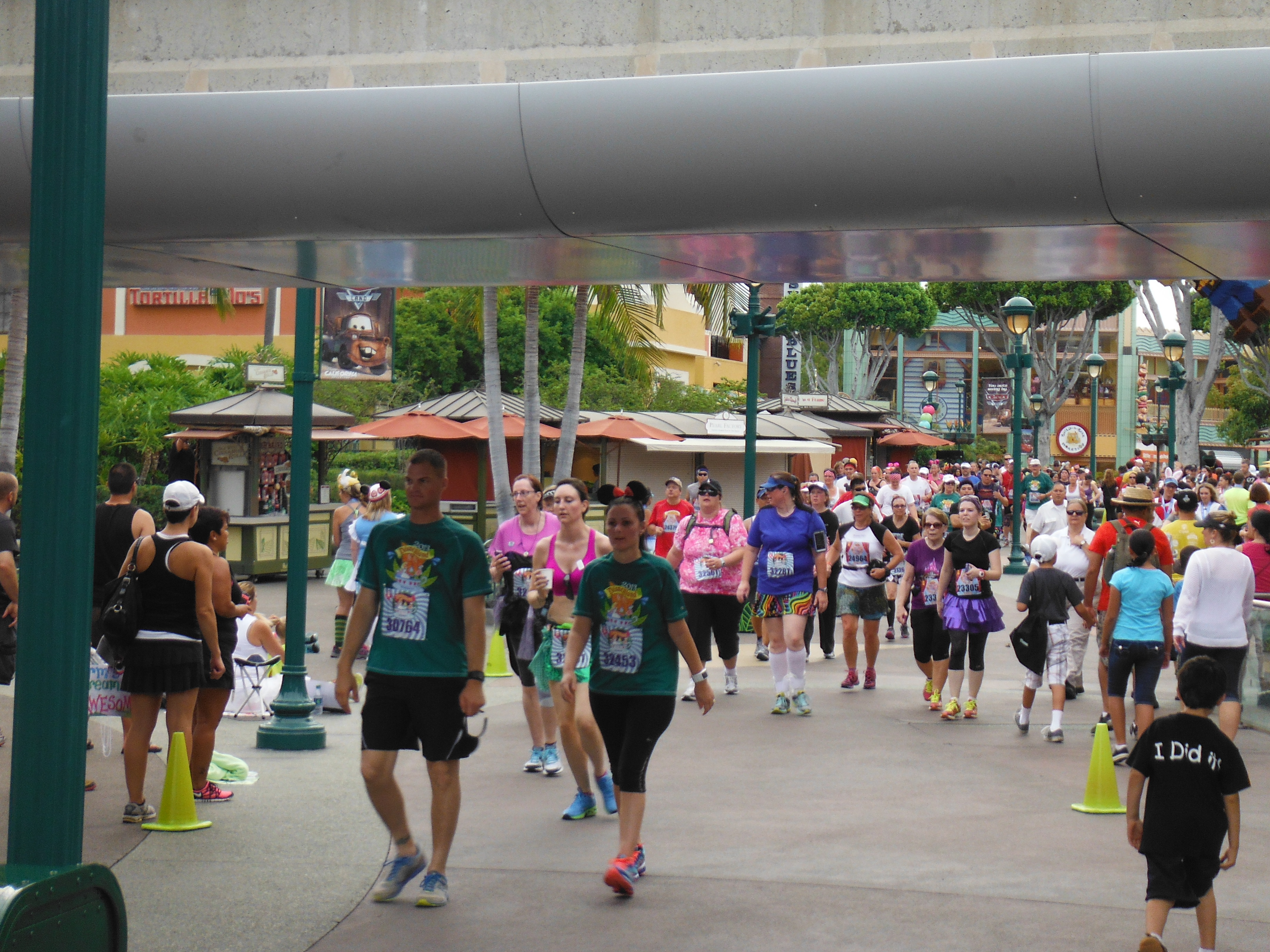 Race Day was finally here, and my wife was out the door by 4:45 AM, the race started at 6:15 and she had to get from the Anaheim Hilton to the race start so an early start was really necessary. Thankfully the kid and I slept in to 7 AM and were able to make it to the park to see her finish the race. Since we were not staying at the part we could, walk, drive or take a bus. We opted for option three since racers and their family got a free bus pass for the weekend, and it really was an easy way to get to the park. Sure lugging a kid, stroller and diaper bag on and off a bus plus navigating Downtown Disney which was part of the race course was a challenge, but worth it, to see my wife running. Run Disney does a pretty good job of alerting family of their racers position so we found a spot and waited. The wait was worth it and in no time flat mommy was running by. By 8 AM it was already 80 plus and humid and would hit 90 plus by mid-day, by far terrible running conditions and weather that made for a very warm weekend. According to my local friends it was the hottest weekend of the summer. I could have easily changed my shirt multiple times during the day.