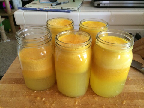 The poor oranges were so cold after I cut off most of the skins. Somehow a few Cara Cara oranges made their way into the bag and they just had to be juiced too.
