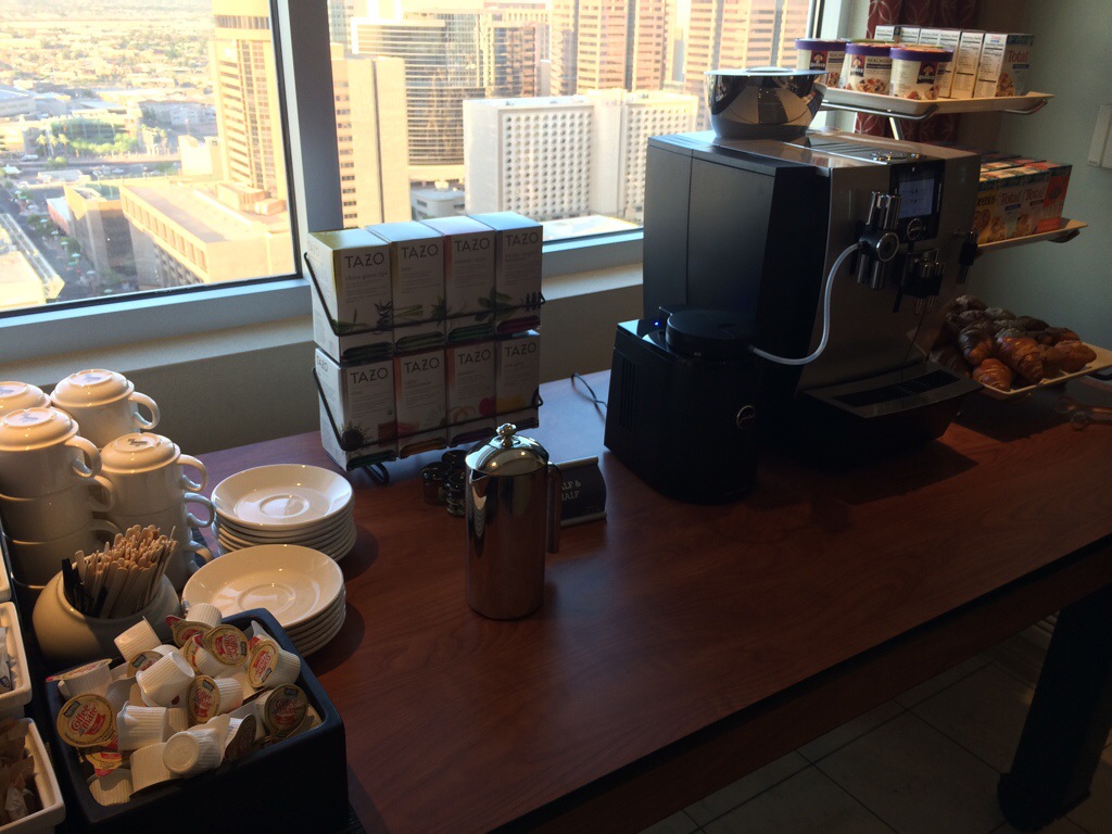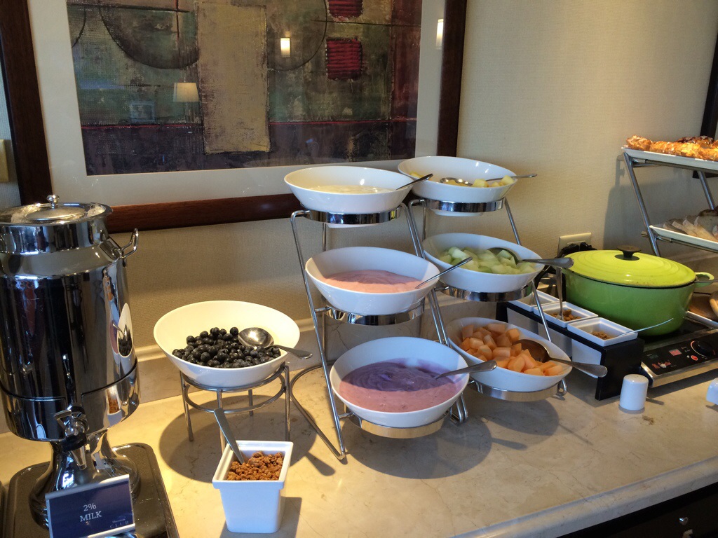 The lounge was open 24 hours a day, which was great. For breakfast they offered a complimentary continental breakfast. This can vary from hotel to hotel, and in this case besides the usual cereals, coffee, tea, juices and yoghurt. They had a nice fresh cut fruit platter, granola, scrambled eggs and an espresso machine. Presentation also goes a long way, and in this case they had most of the items in large ceramic serving dishes or trays, so instead of getting a Yoplait in a plastic cup or granola in a box having it plated nicely made it feel more luxurious. Did it taste better? No, but it made for a nice quick breakfast. Also they offered afternoon appetizers, again complimentary and self-service bar (sadly not free). I went there both nights and each night the hot items were different. One night it was chicken quiche and chicken wellington’s and the second night veggie quiche and beef wellingtons. They also had a really great fruit, nut and cheese platter, with a ton of fancy cheeses, that I would not dare try and spell. I also must mention that the quantities were not limited, they had a lot of food to go around, whereas at some hotels once the first round is gone, they don’t restock. In this case they did a great job of making sure there was plenty to go around. Kudos go to this hotel for making sure this amenity, that some do and don’t pay for actually worth it. Lastly I would be remiss if I didn’t mention one other really nice perk, free bottled water, sodas and Tazo hot teas all day long. It was great to stroll in at 10 PM and grab some cold water before bed, and to take to the office in the morning.