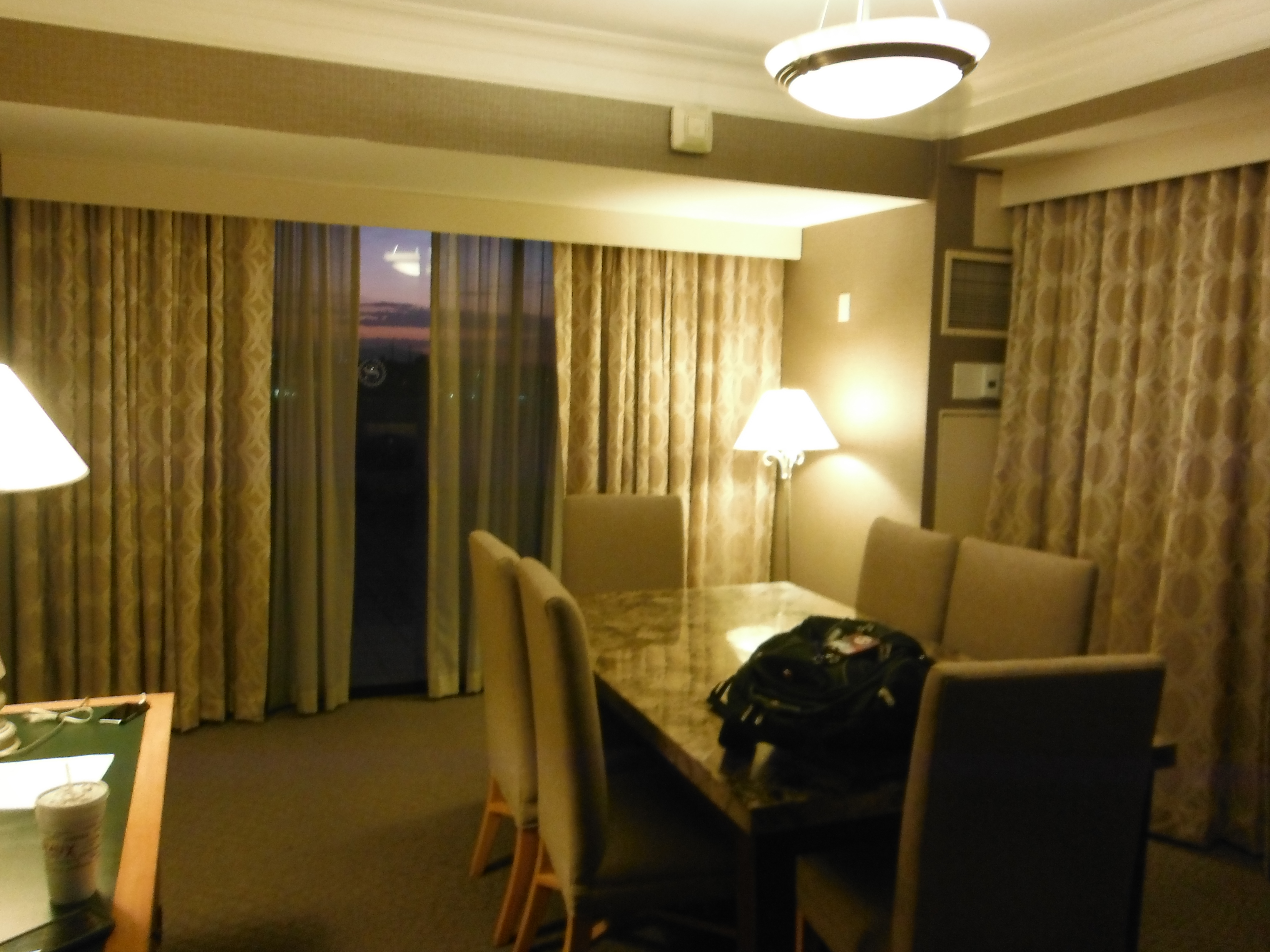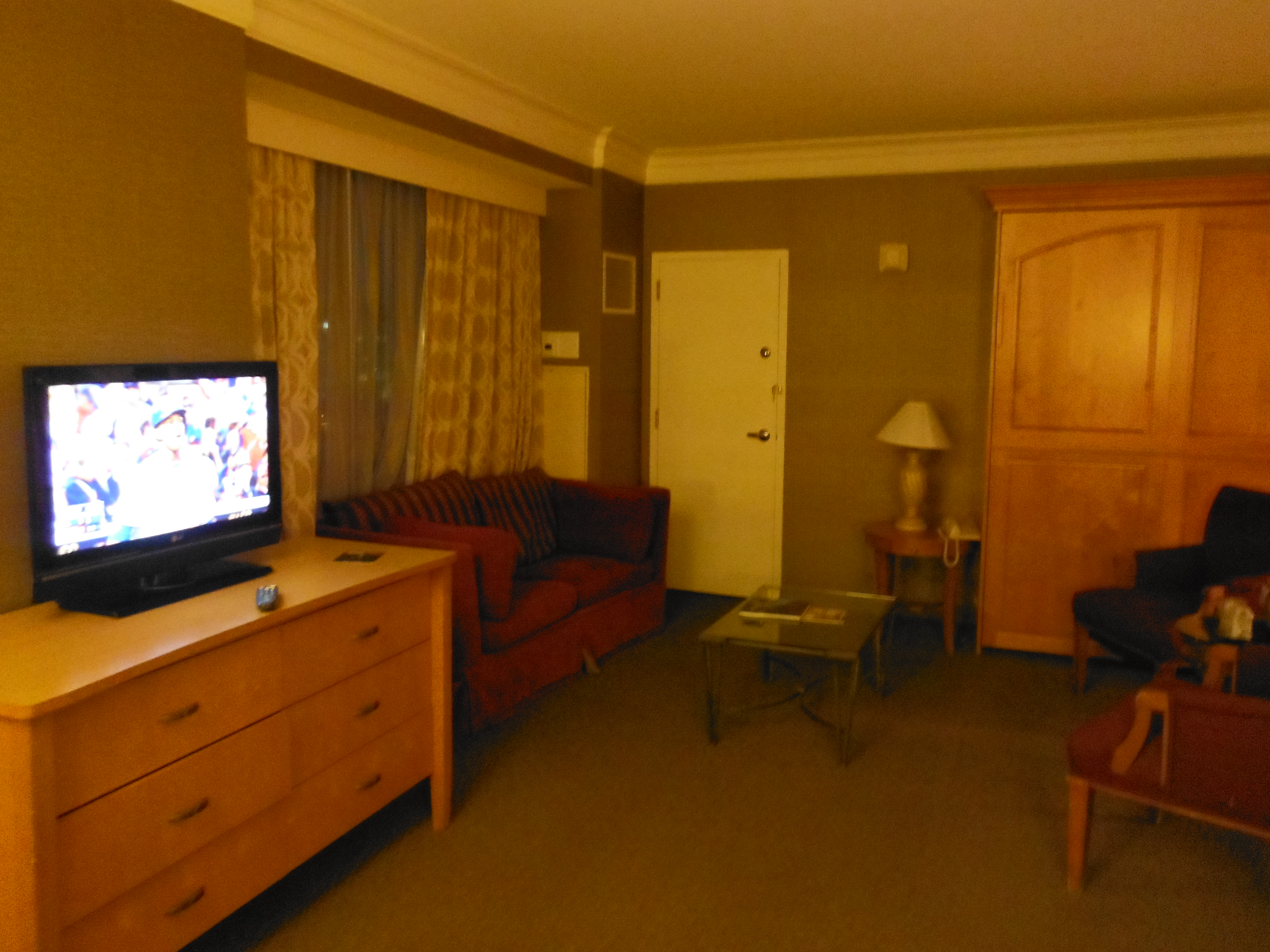 The room was at the end of a very long hall, and had double doors and a small foyer inside doors. Inside the foyer to the left was a hall leading to the bedroom and straight ahead was the dining area and living room. Both interior spaces had their own key card entrances too if you wanted lock them off. I was impressed. The spaces were big, comfortable although the living space was dated it still looked good whereas the bedroom was more modern and also looked good. Side by side a little odd since the decor was different but that’s ok, I’m not complaining yet.