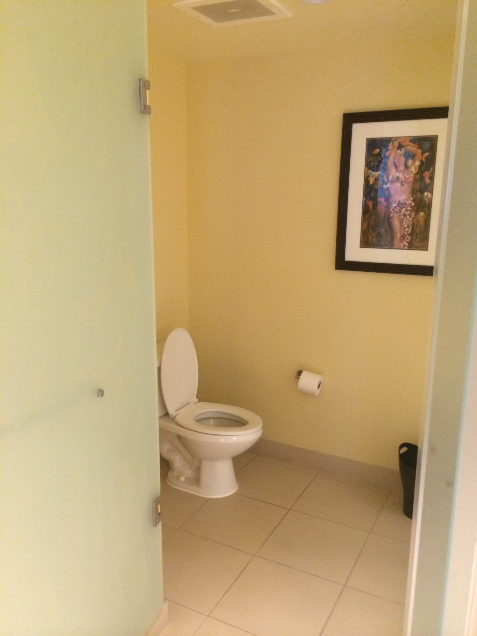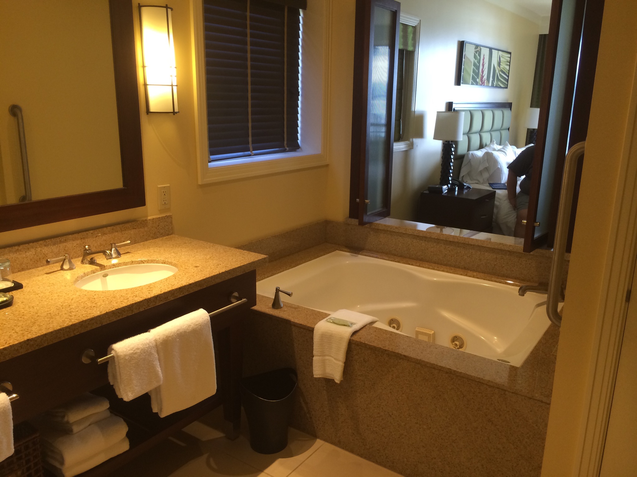 The bedroom had a king size heavenly bed by Westin. Besides the bed and lots of pillows we had two end tables with two sets of drawers, a large TV dresser with four drawers and a medium sized closet. There was also enough space for a rollaway bed. We could have opted to put it in the family room, there was enough space, but we though having her in our room meant we could use the family room after she went down for bed. They also had an interesting feature foldable privacy glass between the bathroom and bedroom, so, if you wanted to take a bath you could still see the ocean. Cleaver I guess.