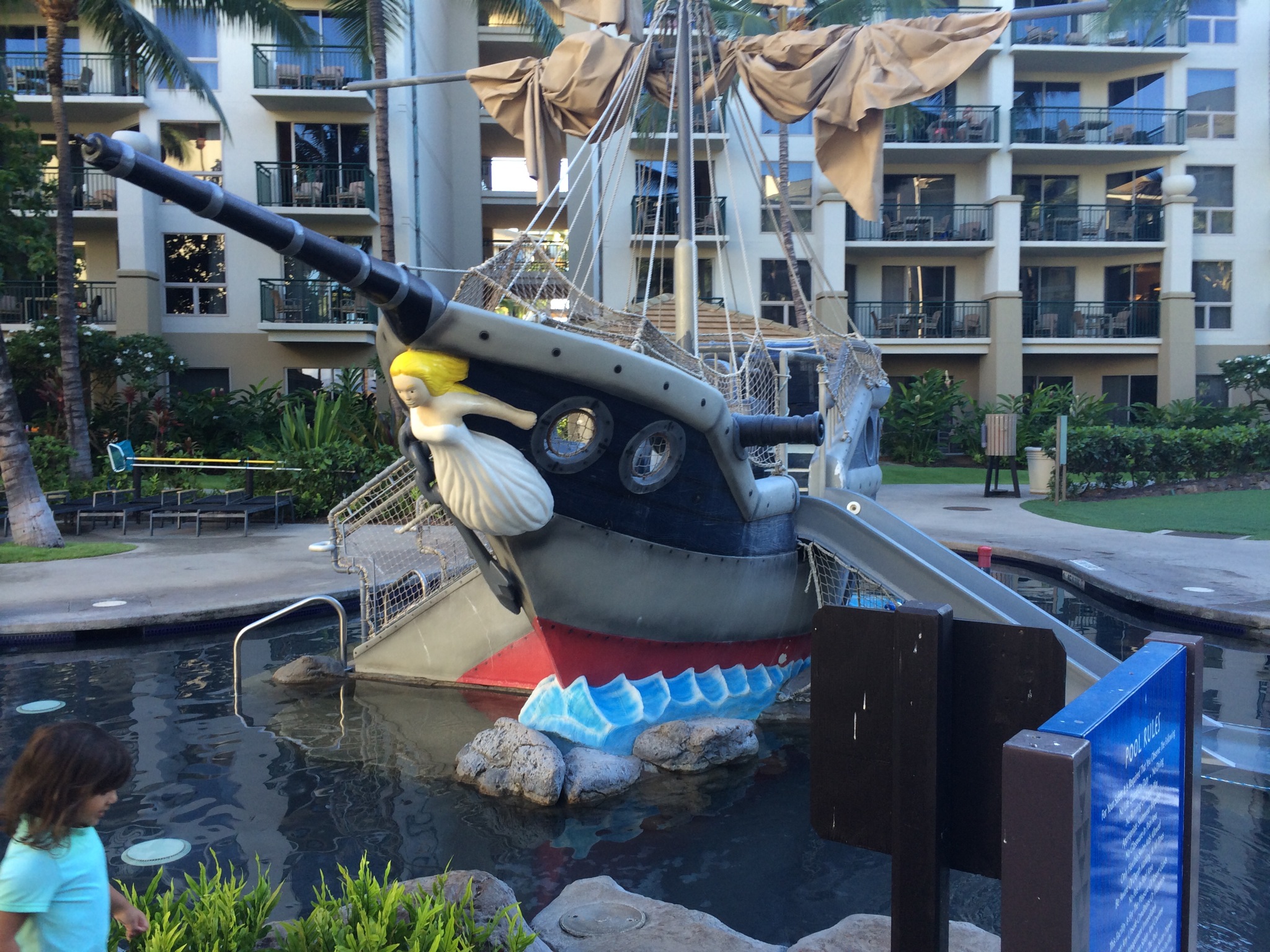 The hotel had three sets of pools. One of which was adults only, we actually never ventured to it since it was off limits to us. A family pool that had a really cool water slide, that kids who could not swim but were wearing floats could use too, and at its deepest was only 4 1/2 feet. It also has a section that was for kids separated from the family pool by a water fall and was only 1 1/2 feet deep. They also had a keiki pool that had an awesome pirate ship and was also only 1 1/2 feet deep. With two small water slides and shooting water. It was a big hit for us until our daughter discovered as she called it the “medium keiki” pool with bigger slide. They also had 5 gas BBQ’s here and also by the family pool too. We only used them once, but they were the cleanest BBQ’s I’ve ever seen. Not a spot on them, they had foil down below the burners, and were kept über clean. I don’t recall a time that I didn’t see them being used, yet I didn’t have to wait to use one either.