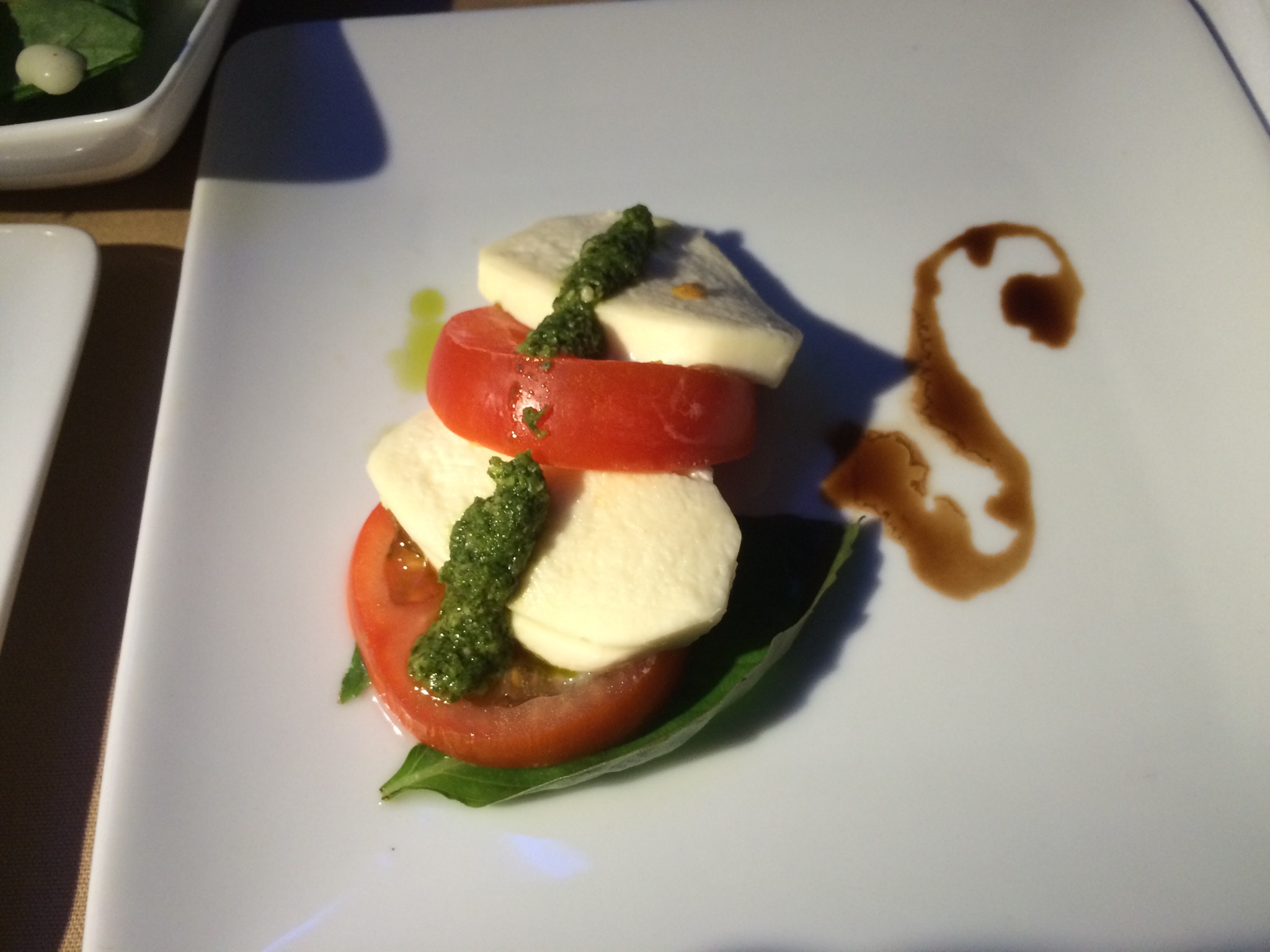 The appetizer consisted of a Caprese Salad with a nice pesto sauce and a sweet balsamic reduction. I really enjoyed it, pretty fresh tomatoes and a tasty medley of cheese and sauces. Yum. As for the salad with creamy herb dressing it was passable. A few over wilted greens, but still good. I did get some bread too, but frankly can’t remember what it was I’m guess pretzel roll, that’s my usual standby on AA.