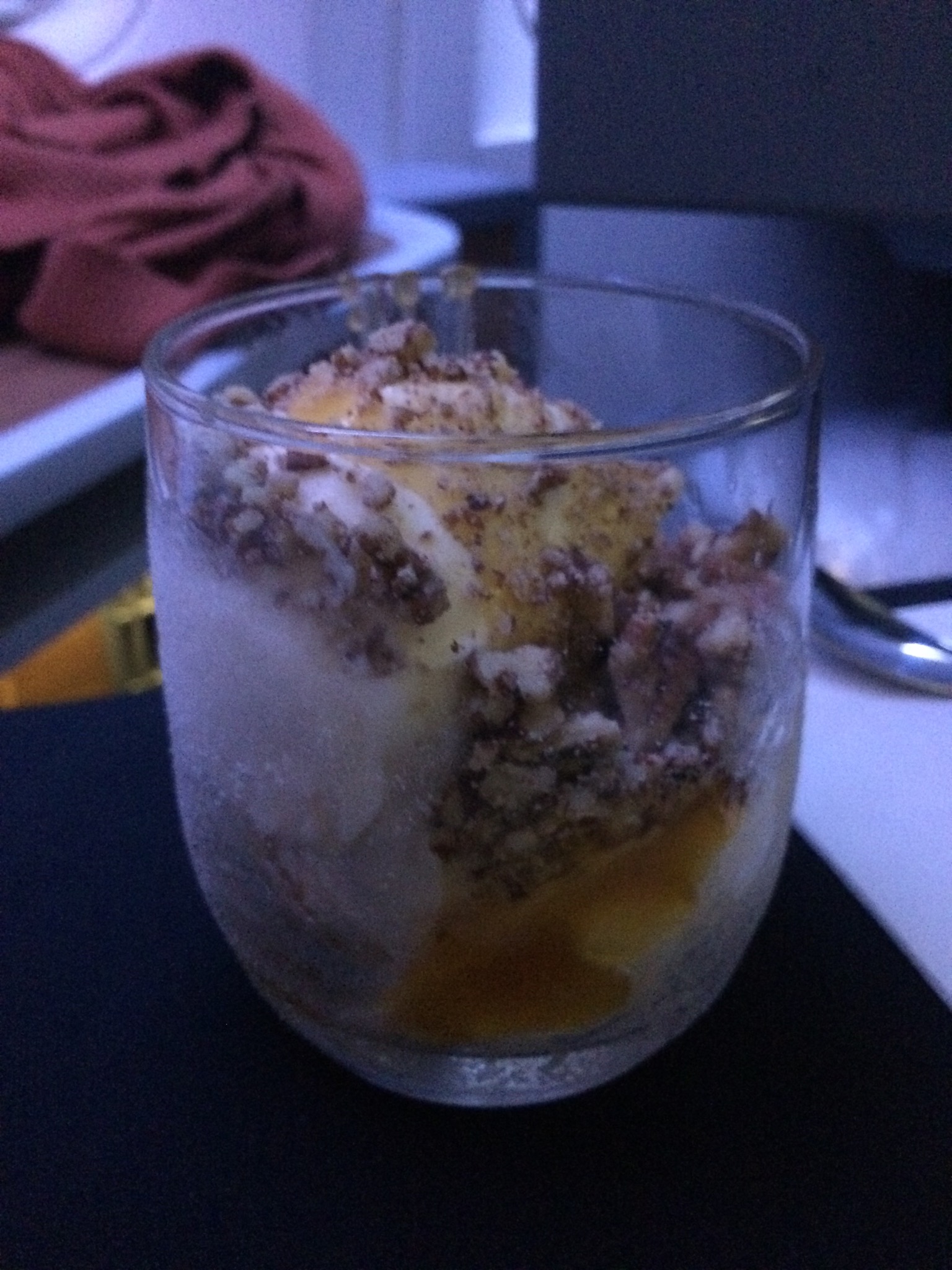 Lastly for desert, Ben & Jerry’s Vanilla ICE CREAM with caramel, nuts and whipped cream. Yum, Yum extra Yum. Just the doctor ordered. I find ice cream sundaes on planes to be just decadent, even though there are so many other amazing options, this one just makes me feel like I’m a King. I can still remember the first time I had a sundae on a plane it was back in 2000, when my now wife and I choose a bump on an oversold United Airlines flight from San Juan to Chicago after a cruise and they put us in Business Class for our troubles for the connection from Chicago to SFO. Back in the good old days UA used a lot of International configured planes on the route and we got one, besides that we got a proper sundae. I had never heard of such a thing and ever since I long for the inflight sundae.