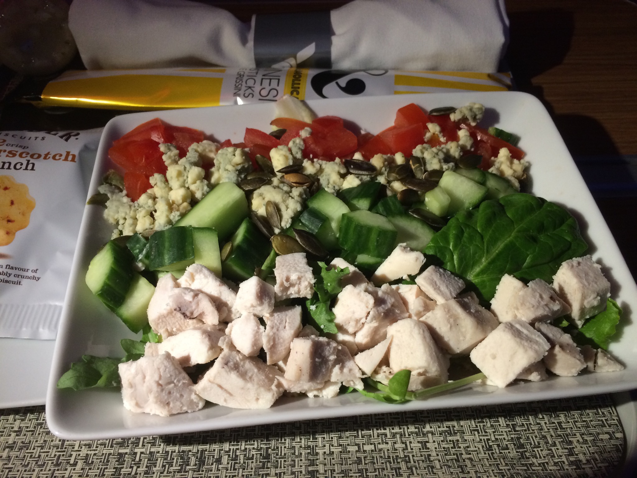 About an hour and a half before touchdown, they offered a lite lunch snack. I choose the chopped salad with chicken, and again got some over wilted greens, but overall a nice light meal prior to landing. Not much else to say about that meal other than to was good.