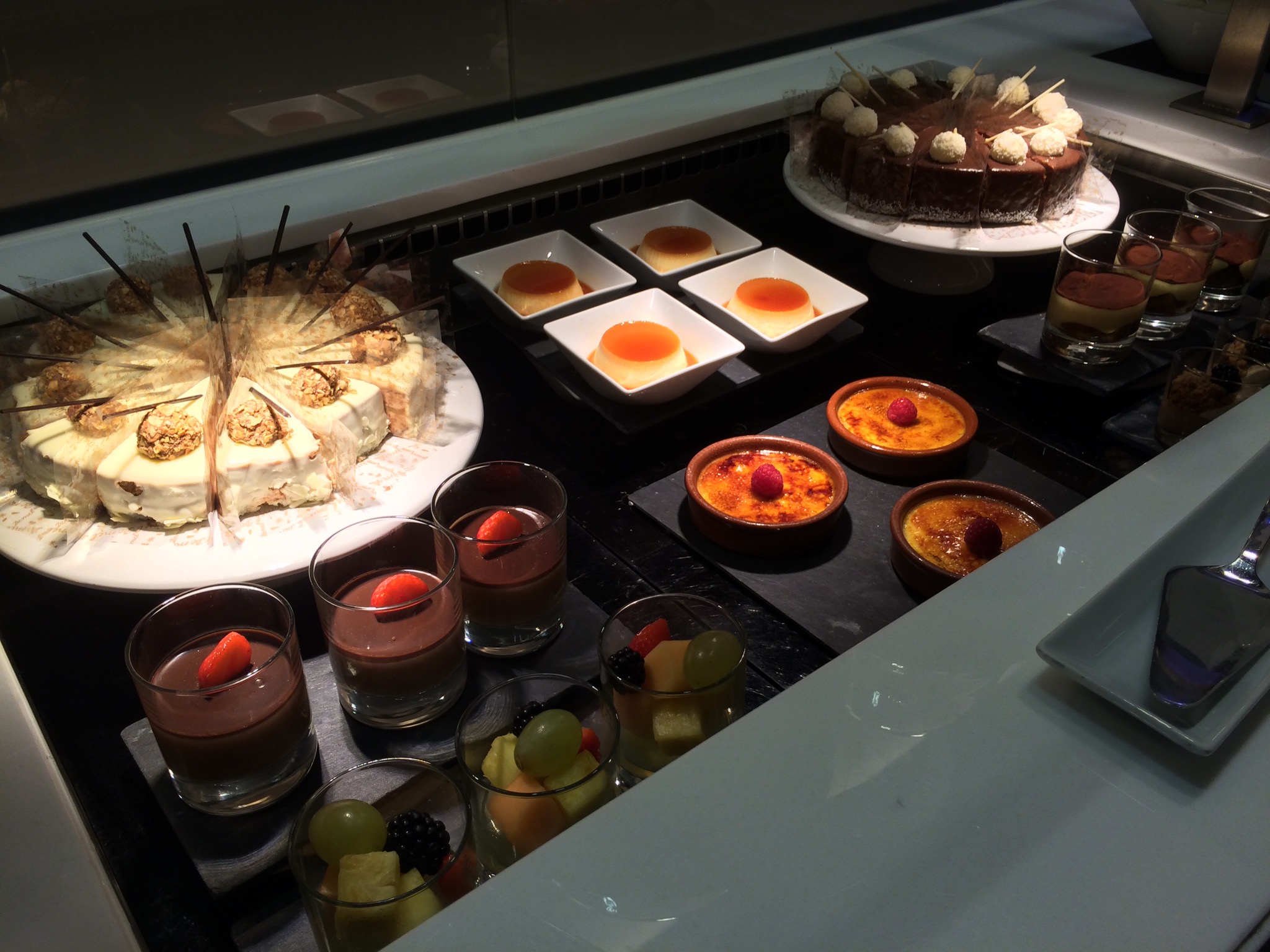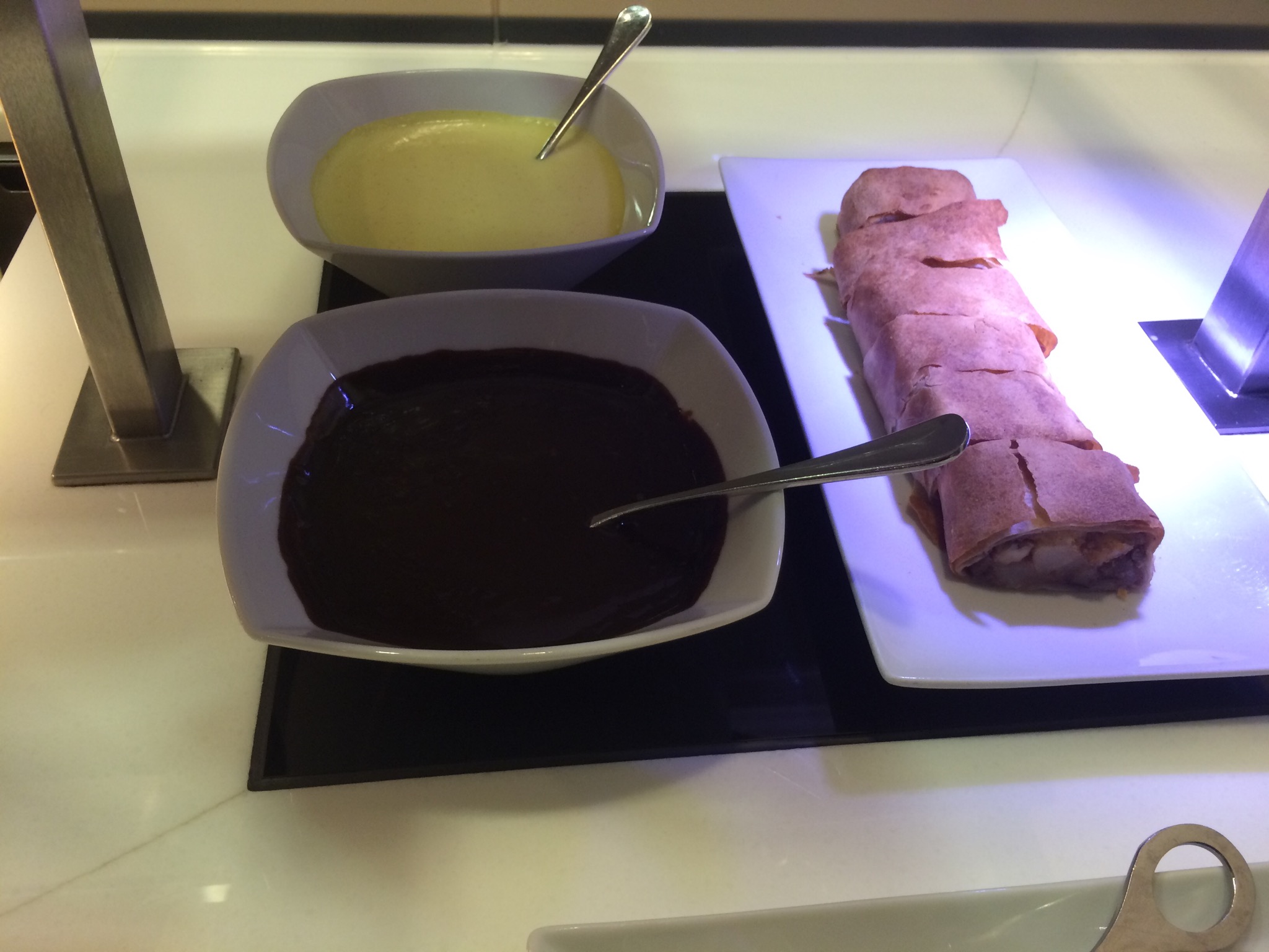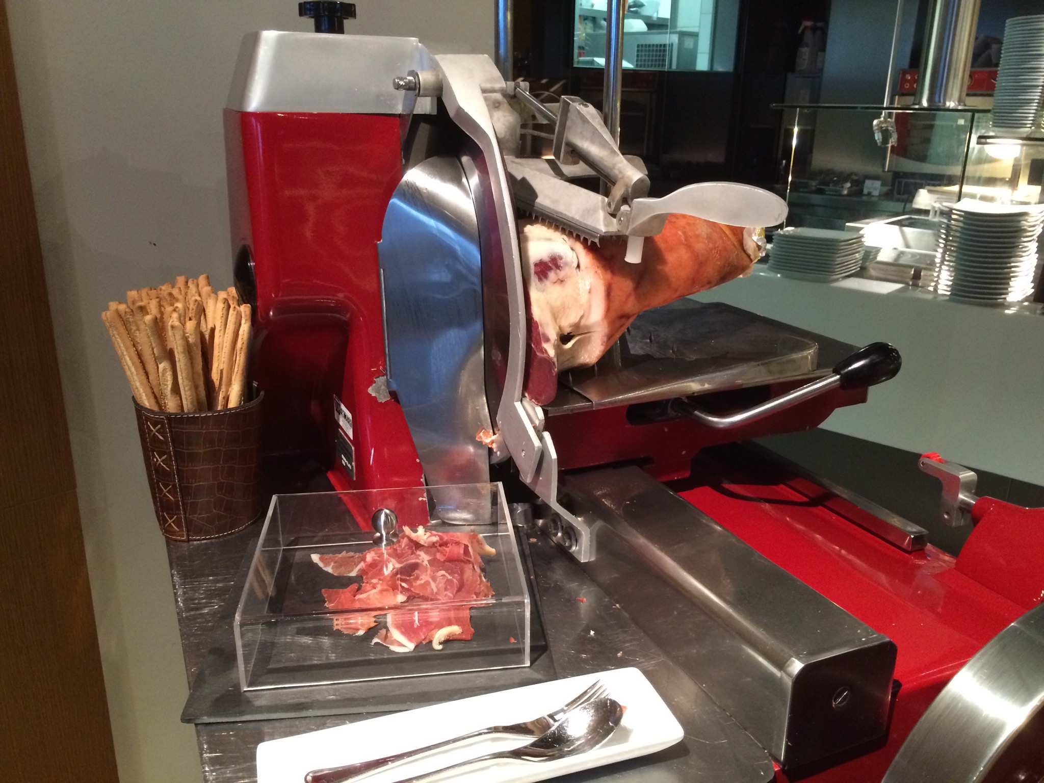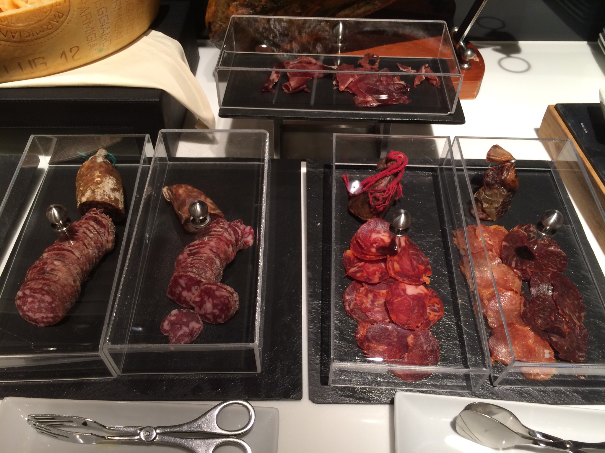 The last thing that made this lounge special was the food spread. We showed up 30 minutes prior to the breakfast/lunch changeover, so we had a chance to eat and sample both menus. Both meal setups, were very diverse and very delicious. Or at least the parts I sampled were. Besides having fresh breads, jams, diverse arrangements of cheeses and meats. They also had fruit, yogurt, and several varieties of muesli, salad and all the fixings. Then on the hot trays they had eggs, sausage, fish, broiled tomatoes, and tons of other items. Check out my snaps to see them. Then came desert, as if I could not have enough!! Cakes, tiramisu, mousse and a pear walnut strudel. Oh yeah did I mention the cured meat legs for our enjoyment? Besides the fresh cut prosciutto on an amazing slicer, they also had a cured deer or elk leg and had fresh sliced it. Damn were they good and incredibly impressive to look at too.