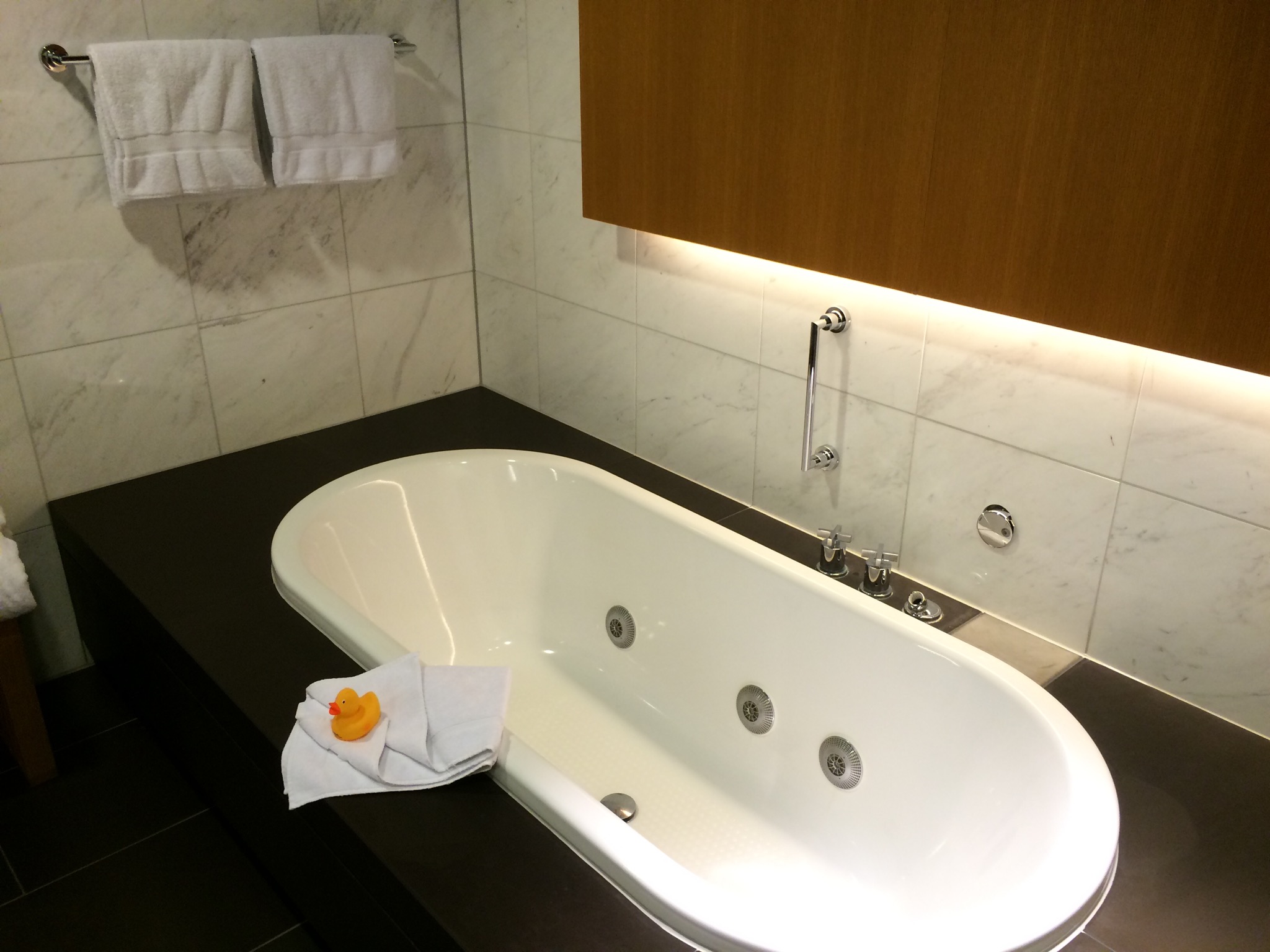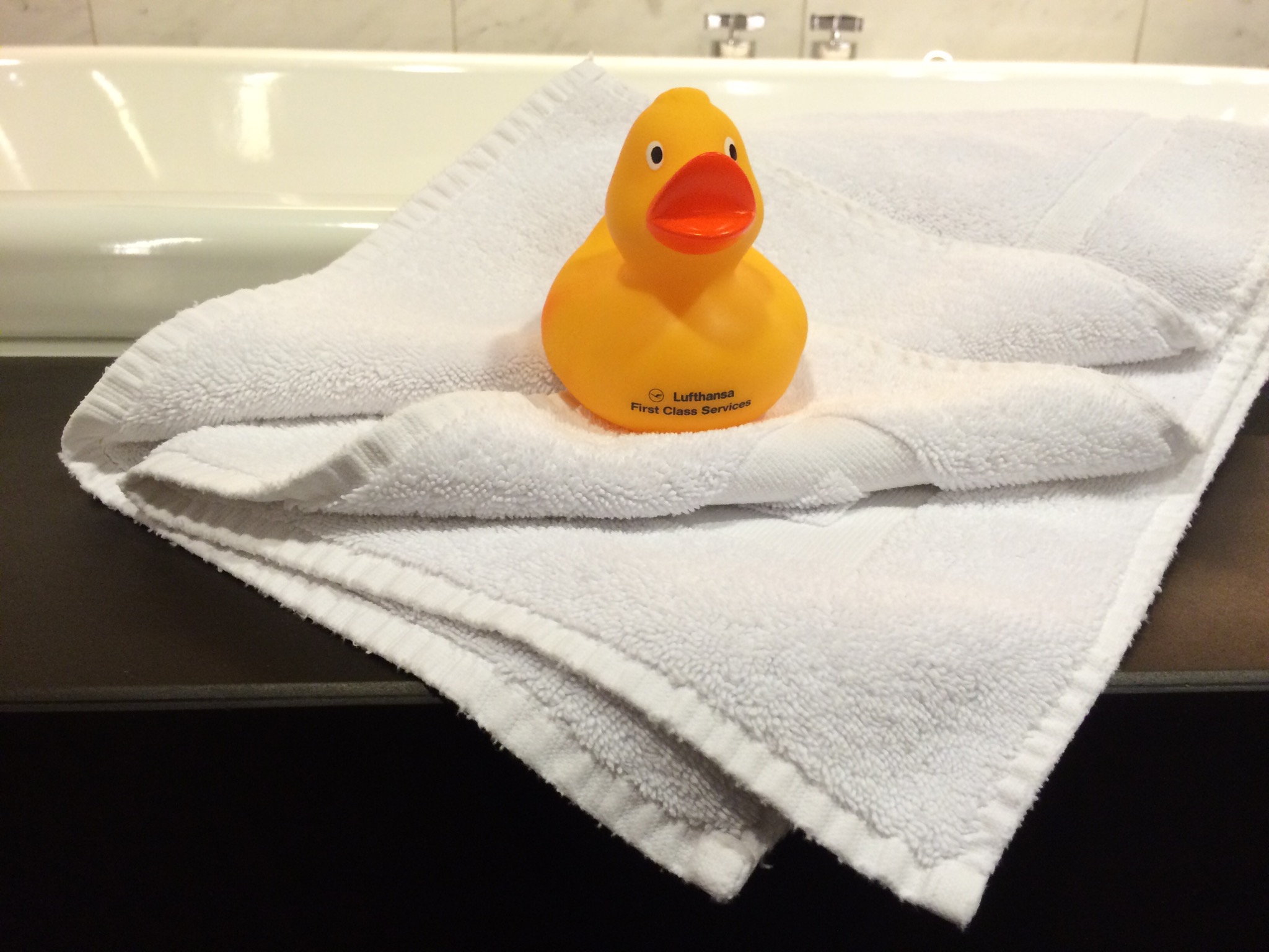 After arriving off a 10 hour flight my wife and I wanted showers and assumed they were just standard shower rooms, boy were we wrong. These were shower and bath suites to be more exact. The room was almost as big as our whole bedroom at home. Not only did it include an amazing rain shower, it also had a full size tub. What seriously? Beyond that it included some really nice bath amenities by Etro (never heard of them) but they were great, and the traditional Lufthansa rubber duck. I only thought you got these in the First Class Terminal, so I was very surprised and happy to get one. One of those silly silly amenities that I just wanted to get. Now I have a gift for my kid too, she will be very very happy. The shower was just what the doctor ordered and allowed me to get refreshed and pilfer some shower supplies for the Casa.