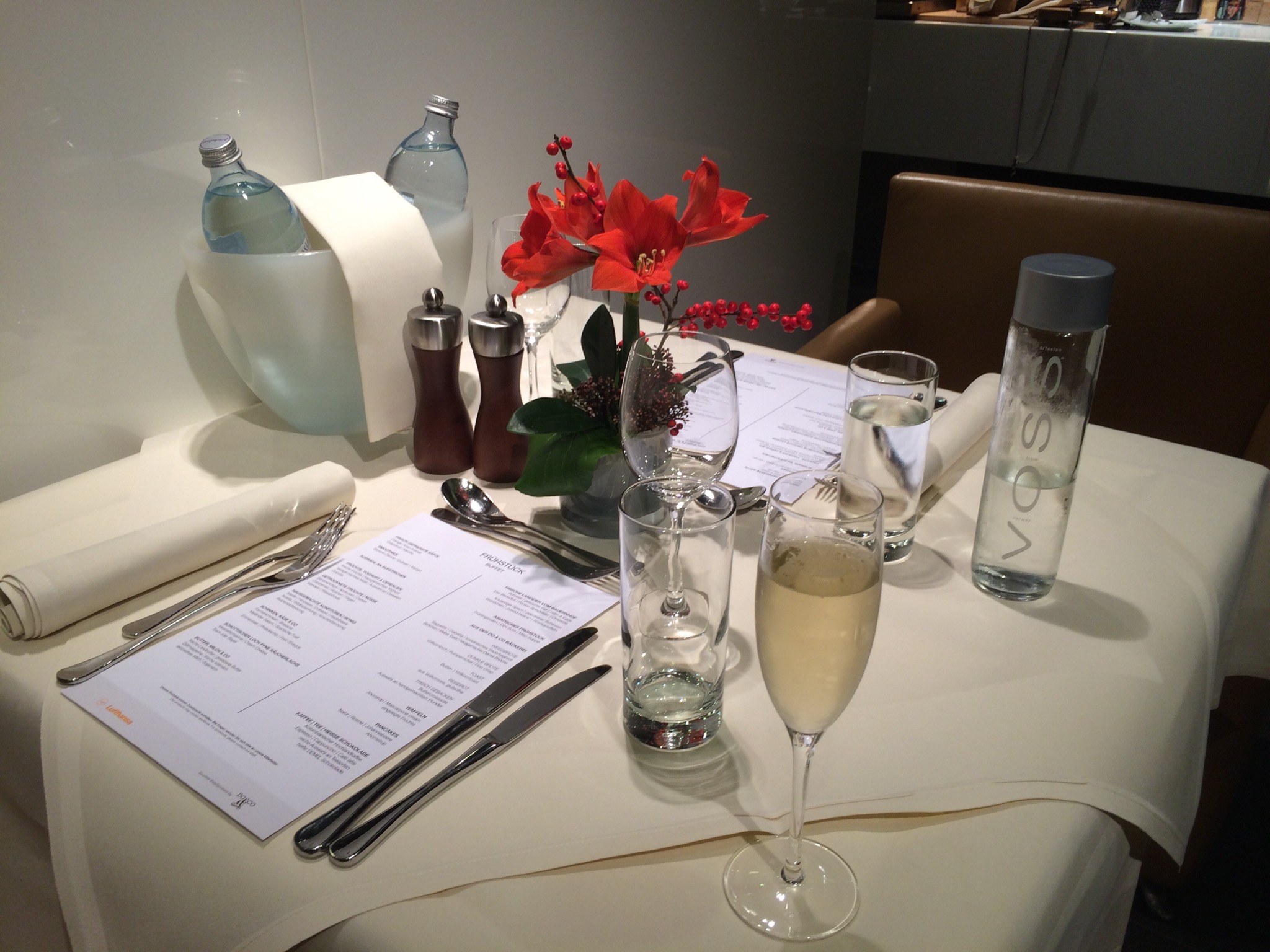 The lounge was impressive and I think I loved it even more because we had no idea we would get to use it. So I had not built up the potential experience in my head yet or read much about it. For me it definitely stands next to Singapore’s Private Room and Qantas First Class Lounge and in some degrees is leaps and bounds better. Between the escorts to the terminal, the expansive bar menu and incredible meal service I was blown away. Sure SQ and QF have plated meal service, but their bar menu (impressive in its own rights) is not as nice as LH’s. Plus the shower suite. The others have a nice room, but not to the degree as LH again.