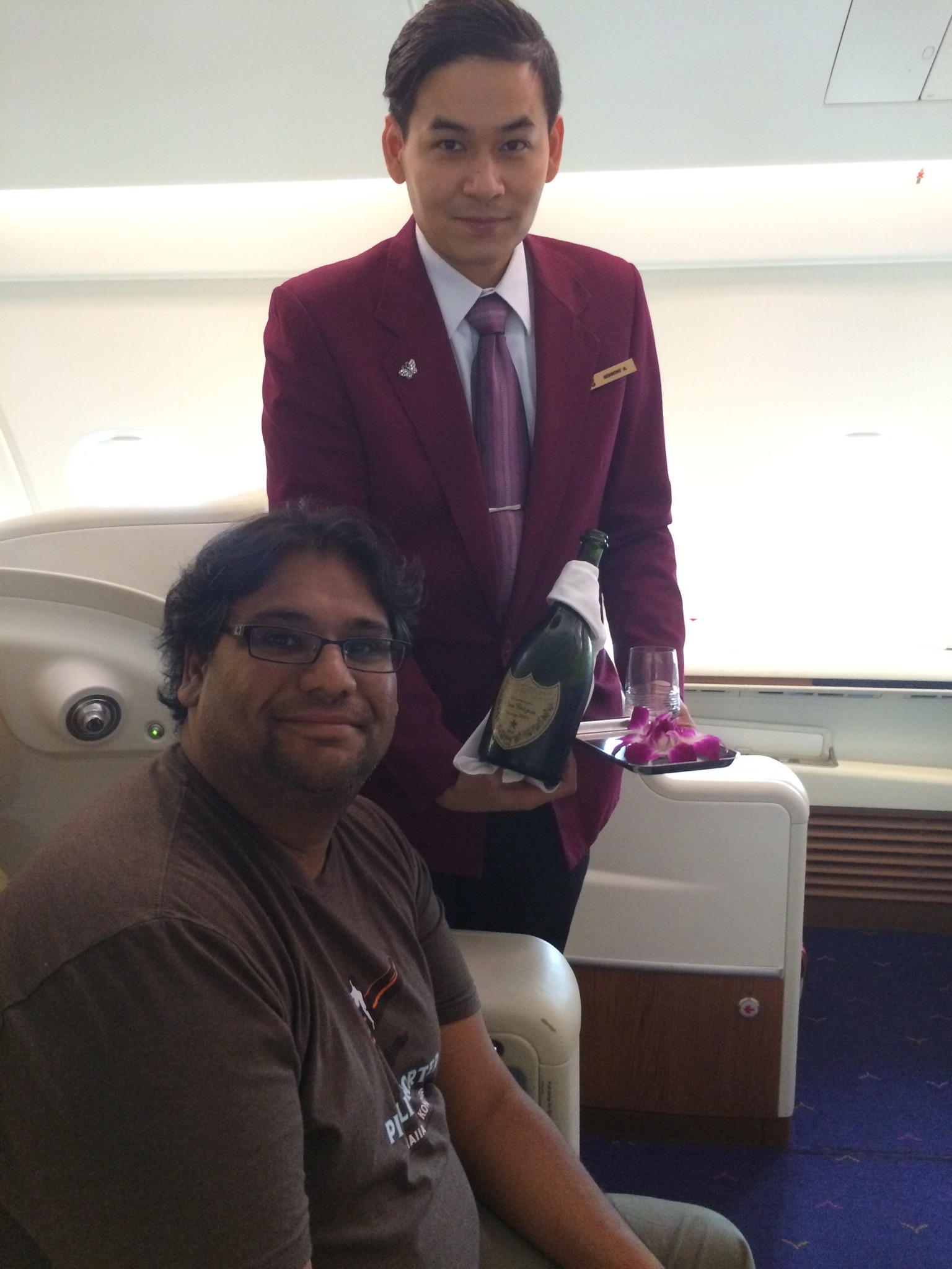 I enjoyed the space and the upper deck as well as having a try at the a380 in First. That was just great, the service was also pretty good not great. I think the language barrier had a lot to do with that. Hey I can’t speak Thai, so I don’t fault anyone, but it was hard to get my message across a few times, and I know they were trying just as hard as I was to understand each other. But that being said they were all so friendly and were dong their best to make us happy. I also think that if they want to truly offer a world class first class product they need to offer more inspired and varied food choices as well as a better spirit selection. To have the menu say Scotch, Rum, Gin or Vodka, makes me think I’m flying United or American and not Thai. I guess what I’m trying to say is that this showed me that my love for Singapore and Cathay Pacific Airlines is no joke, they truly take in-flight service to another level.