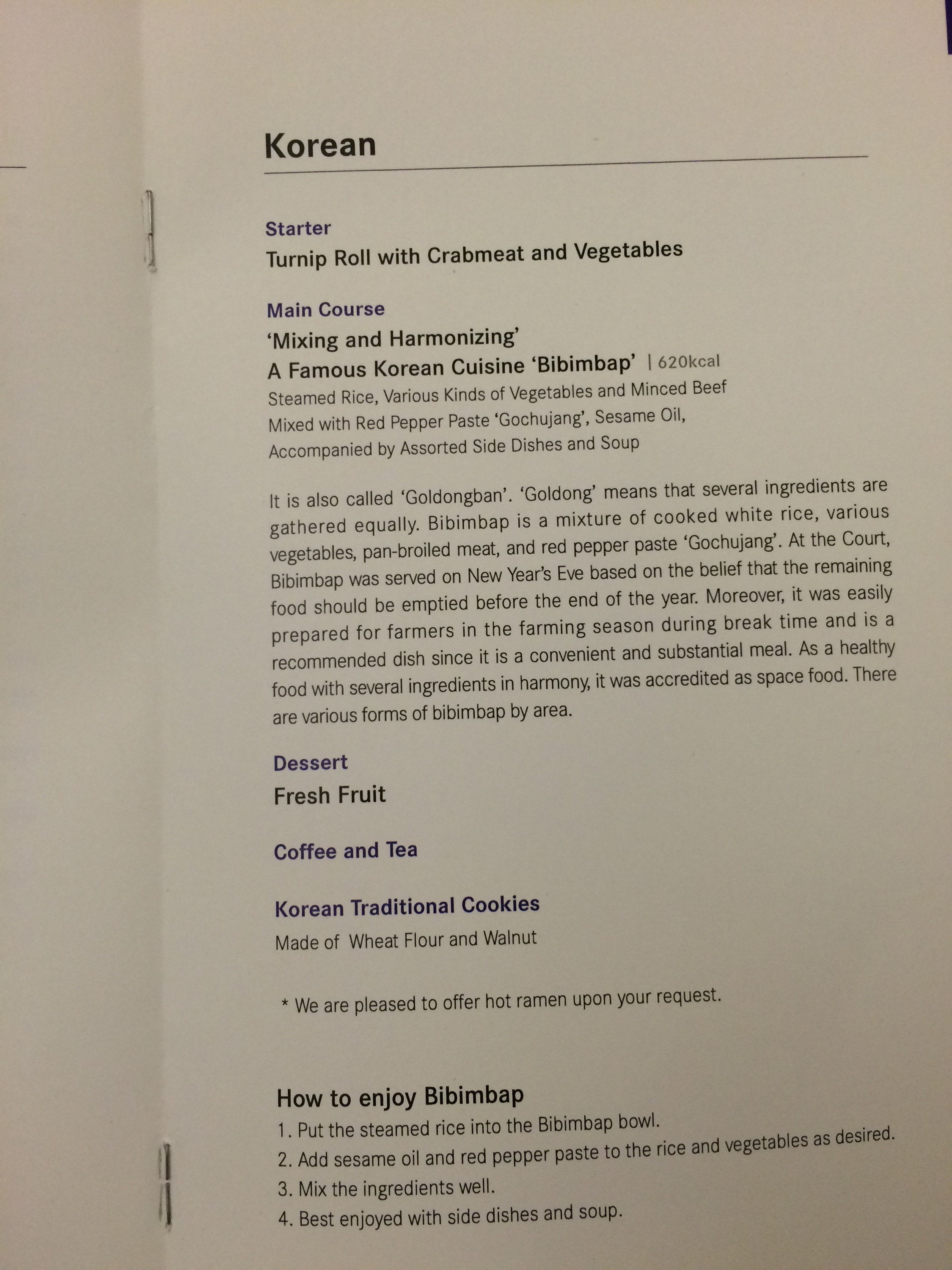 Asiana flies an Airbus a330-300 on this route which features 30 Angled Flat Business Class seats in a 2-2-2 configuration and either 245 or 260 Coach seats in a 2-4-2 depending on the configuration, I have no idea which one we flew all I knew was that I needed to get some sleep it was late and I was exhausted. Upon entering the aircraft I was immediately struck by the staff. They were all so courteous and friendly the chief flight attendant in the Business class cabin made a point to go to each row kneel to get at eye level and welcome us on the plane. She did this row by row section by section. It was pretty incredible. She went on to make sure to tell us that if we needed anything to ask. She also came by and provided eye shades, slippers and the dinner menu. I was immediately impressed with the carrier and the service so far. On all accounts I’ve read about Asiana, this is the type of product they offer. Incredibly courteous staff and very polished service.