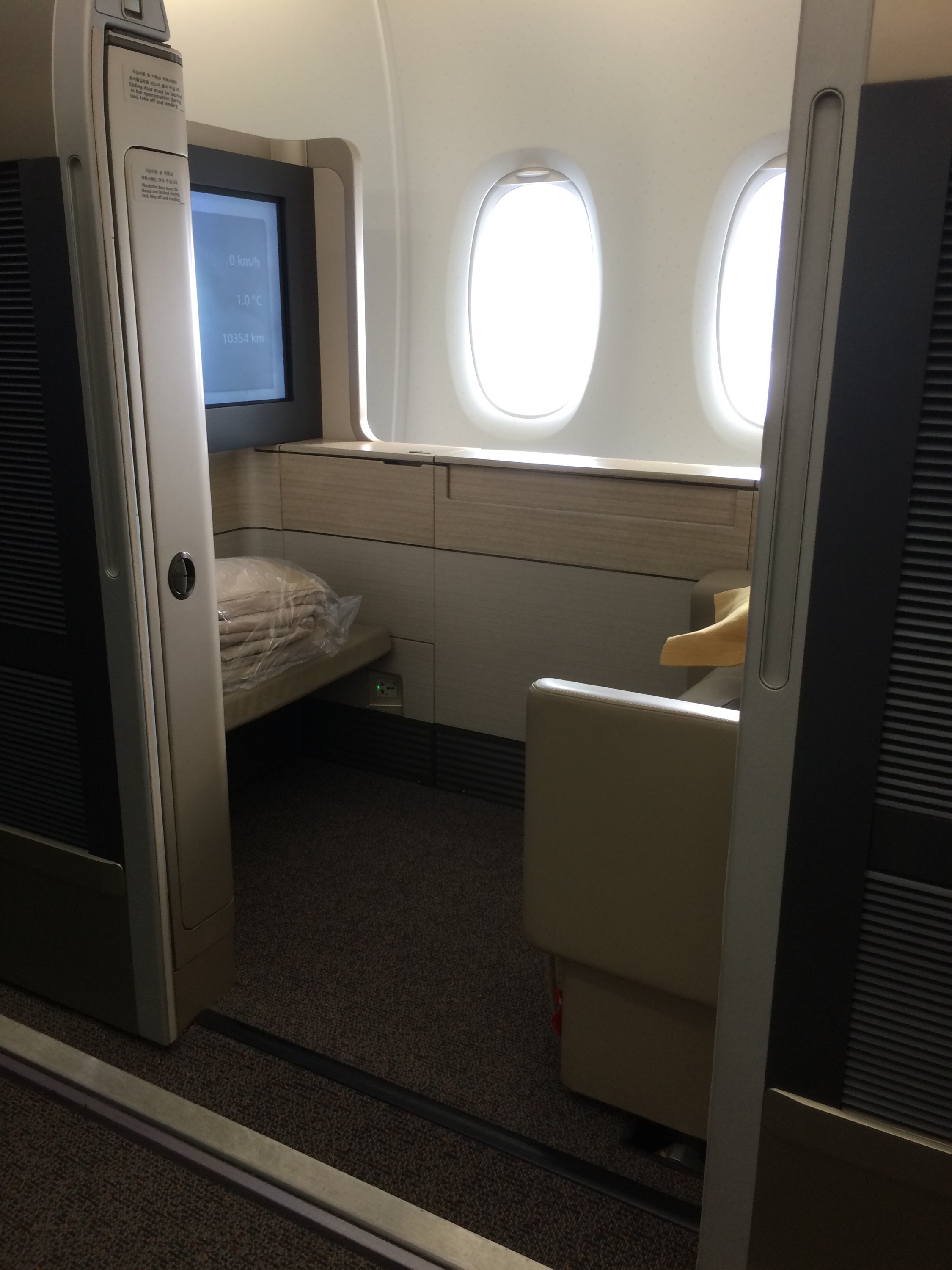 The First class cabin layout is at the front of the plan on the lower lever and consists of 12 seats 3 rows in a 1-2-1 configuration, on this flight it was 7 of 12. The seats are actually more appropriately called suites because they have sliding doors on one side, yes that’s right sliding doors that completely ensconced the suite. So effectively you have a fully private seat and 180 degree lie flat space. Also the TV screen is upwards of 30” and you’re provided and iPad like device to control the seat position and lighting. Just incredible. More on the suite shortly.