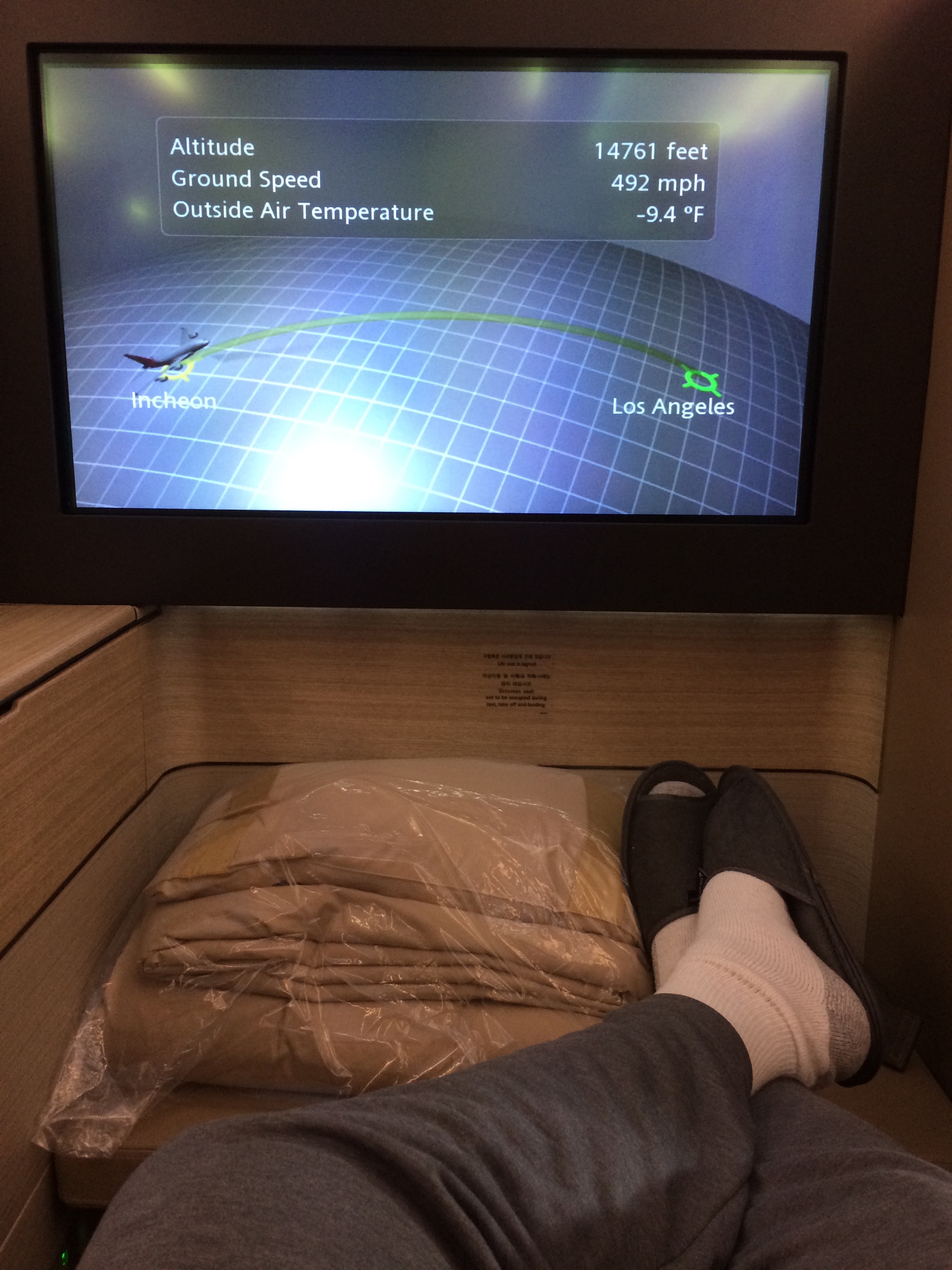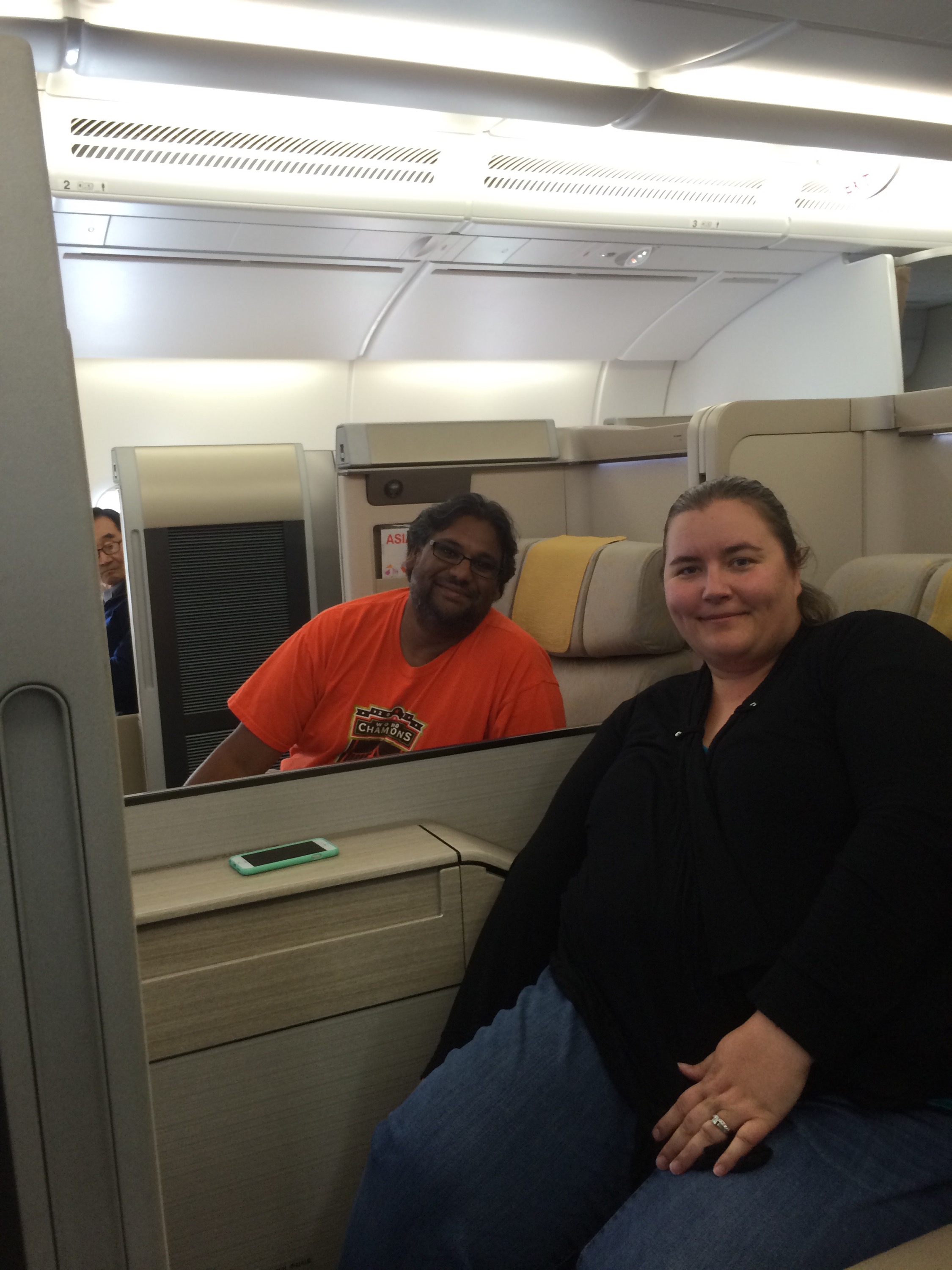 We were very well rested for our 10 ½ hour flight from Seoul to LAX. We had an 8 hour layover in Seoul and just lounged around the lounge, getting back into non-vacation mode. About 45 minutes prior to our flight and agent for Asiana met us at the lounge and escorted us to the gate. This was a nice touch. They were in the mix of boarding, but he just walked right up to the ticket reader scanned our tickets and escorted us to the plane, and handed us over to the cabin crew. Pretty damn cool. I tried not to look at the people starring at us wondering why we were getting special treatment.