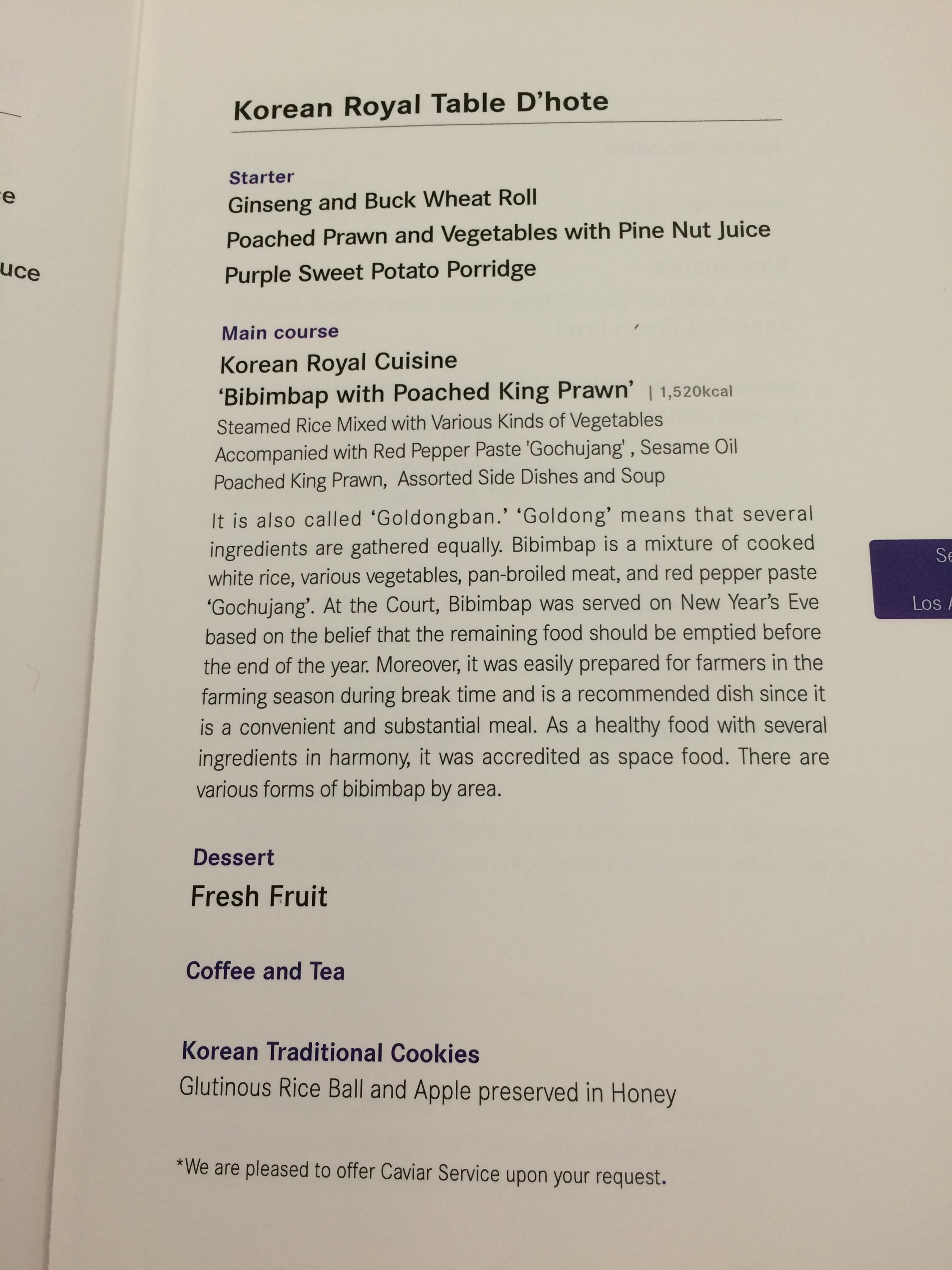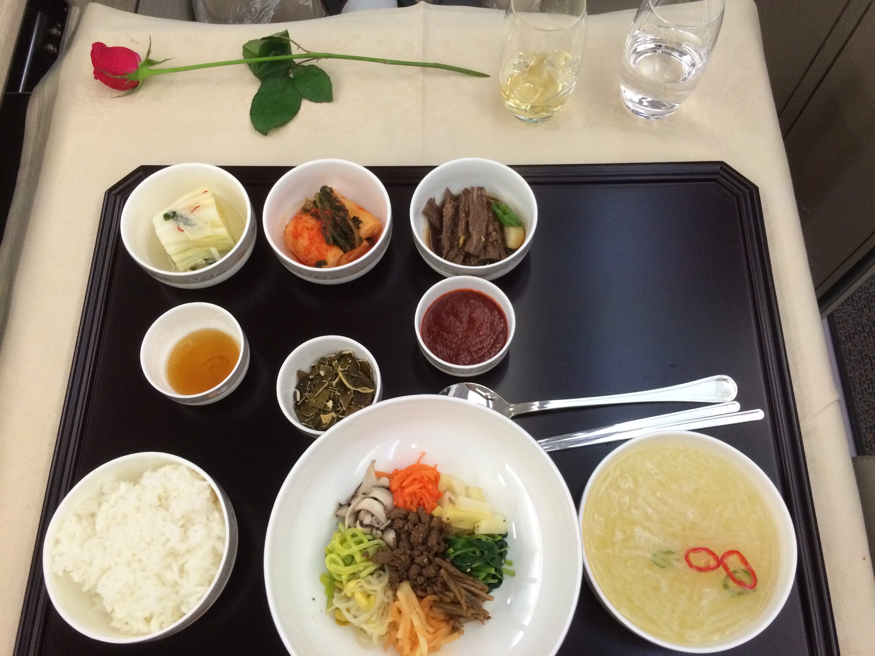 Finally we were provided with the drink and dinner menu. I was truly impressed with the drink and food selection. I would say they could give Lufthansa and Singapore a run for their money on variety of drink options in the air and blow Thai out of the water. I had so many choices to make I was just not sure what to do. My heart was in a tizzy. What do I drink? What do I eat? Will it pair well with my meal? I mean seriously can you have JW Blue with caviar? What goes best with BiBimBap? I know first world problems here. But what can I say, when in Rome you’ve gotta live it up as long as you don’t act like a total idiot.