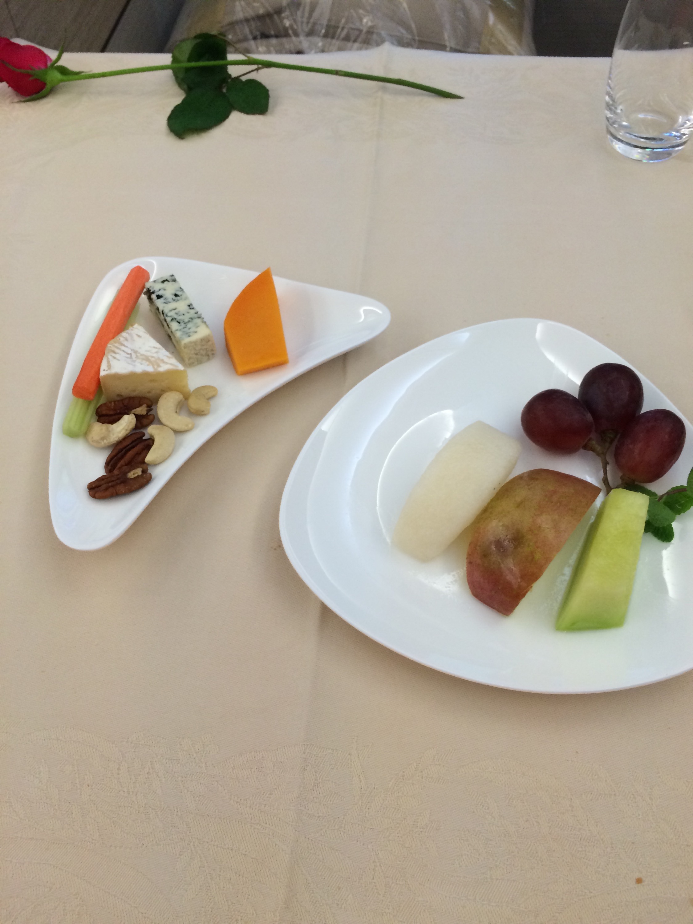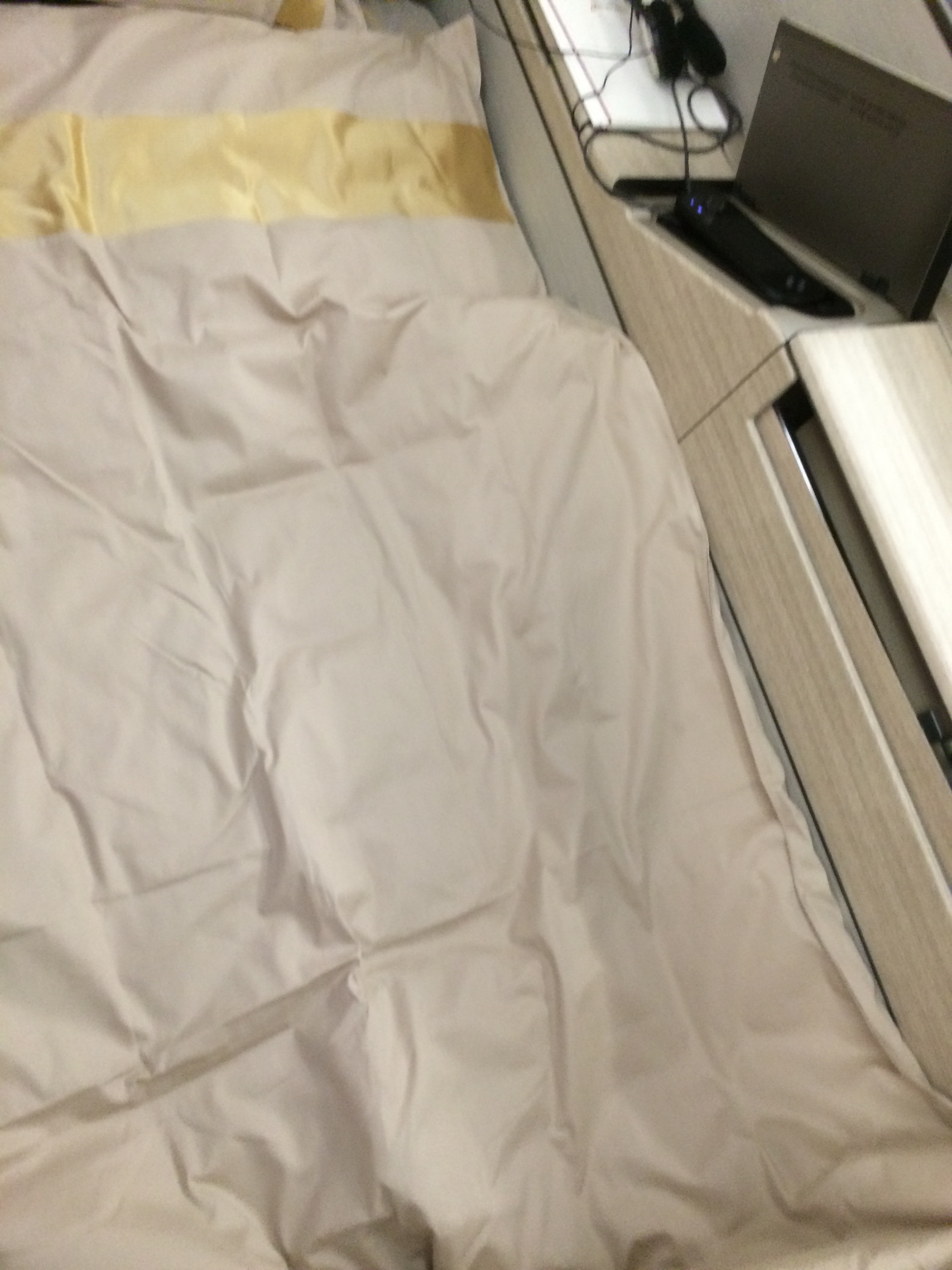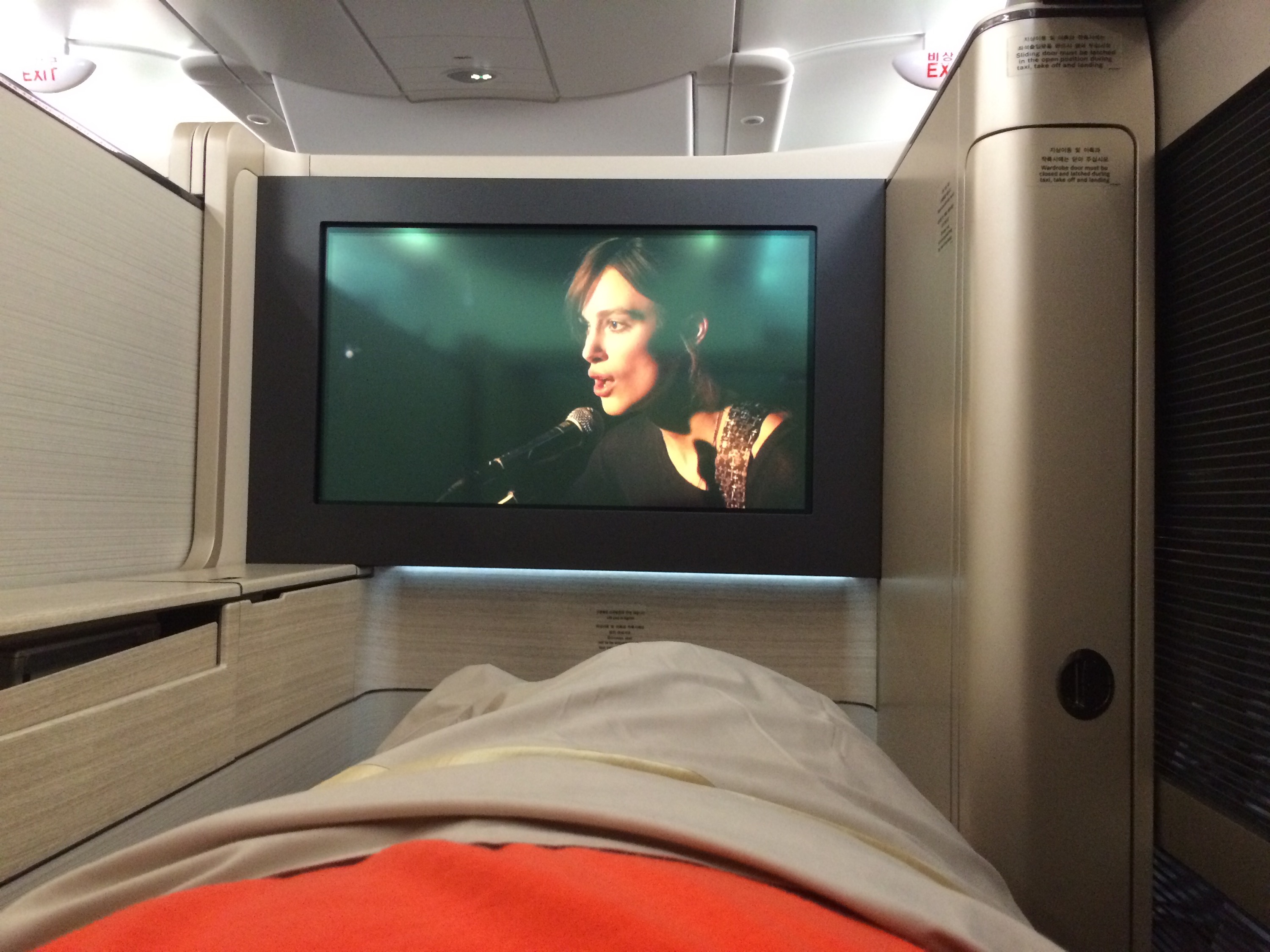 The other amazing thing about this plane was the seat. This was my first time in a fully enclosed capsule. I was just so excited. Not only did the seat lay flat 180 degrees, and have plenty of room for my trim body, but also the privacy because of the sliding door and privacy scree between the middle seat. Beyond the general comfort of the seat, the staff provided a duvet for your seat and a very nice blanket and pillow. Although I find these days in these plush seats more than one pillow is needed to make me comfortable. Mental note carry my Anna & Elsa one from home next time. Also, because the seat enclosed on all sides, you felt like your were in your own capsule room. With TV, remote, headphones and light control. All that was missing was the person to hand feed you cheese and fruit. But since the service was stellar, I was okay w/out that the servant. Ha ha. But seriously, the staff were attentive when you wanted and left you alone when you wanted. They just knew how to take care of your without you asking or lifting a finger. In my case shortly after the wonderful meal I wanted my bed made, they took care of that and I promptly fell asleep. My intention was to stay up watch a few movies and have a few more glasses of something, but I just couldn’t keep my lid open. I really wanted to take a tour of the coach and business class sections as well as the business class bar on the upper deck, but I could not motivate my body out of its snoring slumber. Then about 1 hour prior to landing I woke up and they immediately made my seat up and provided me with some hot tea. They were just starting to secure the cabin for landing, yet seemed unfazed with a drink request or providing me a meal if I wanted it. Try getting that from United or American. I had declined breakfast, I was just not hungry. It looked good from peaking over at my wife, but the thought of one more morsel made me ill. Too much dinner for this guy.