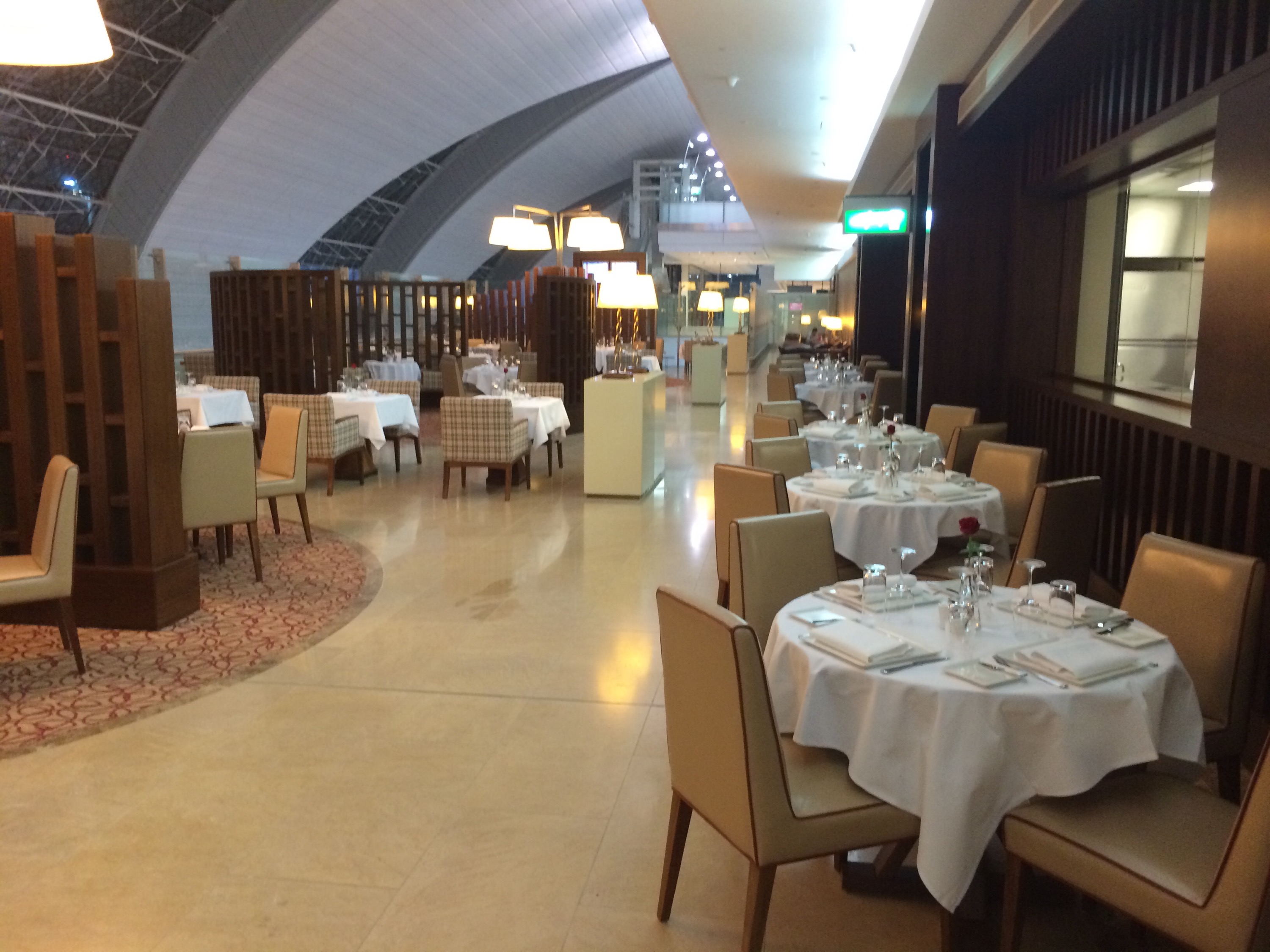 After a quick scanning of my boarding pass I was in. The greeter directed to either go left or right once in the lounge and that’s about it. I had to inquire on how to book a spa service or how to access my gate. At the time of my arrival I was informed that my flight was departing from another terminal and that I would have to make my way there on my own, and that they didn’t make any announcements in the lounge unless there was a delay or gate change. Frankly I was a little disappointed in the lack of service or just basic information about what was where. The lounge has a very large quiet room, free Wi-Fi, mini-buffets throughout, a dining room with table service, showers and even duty free, as well as gate boarding access to all T-3 flights. None of which I was told about. For a world class airline this was kind of a surprise. Lufthansa and Singapore in their flagship lounges walk you to your seats, take drink orders and help you get settled. Emirates get with the program.