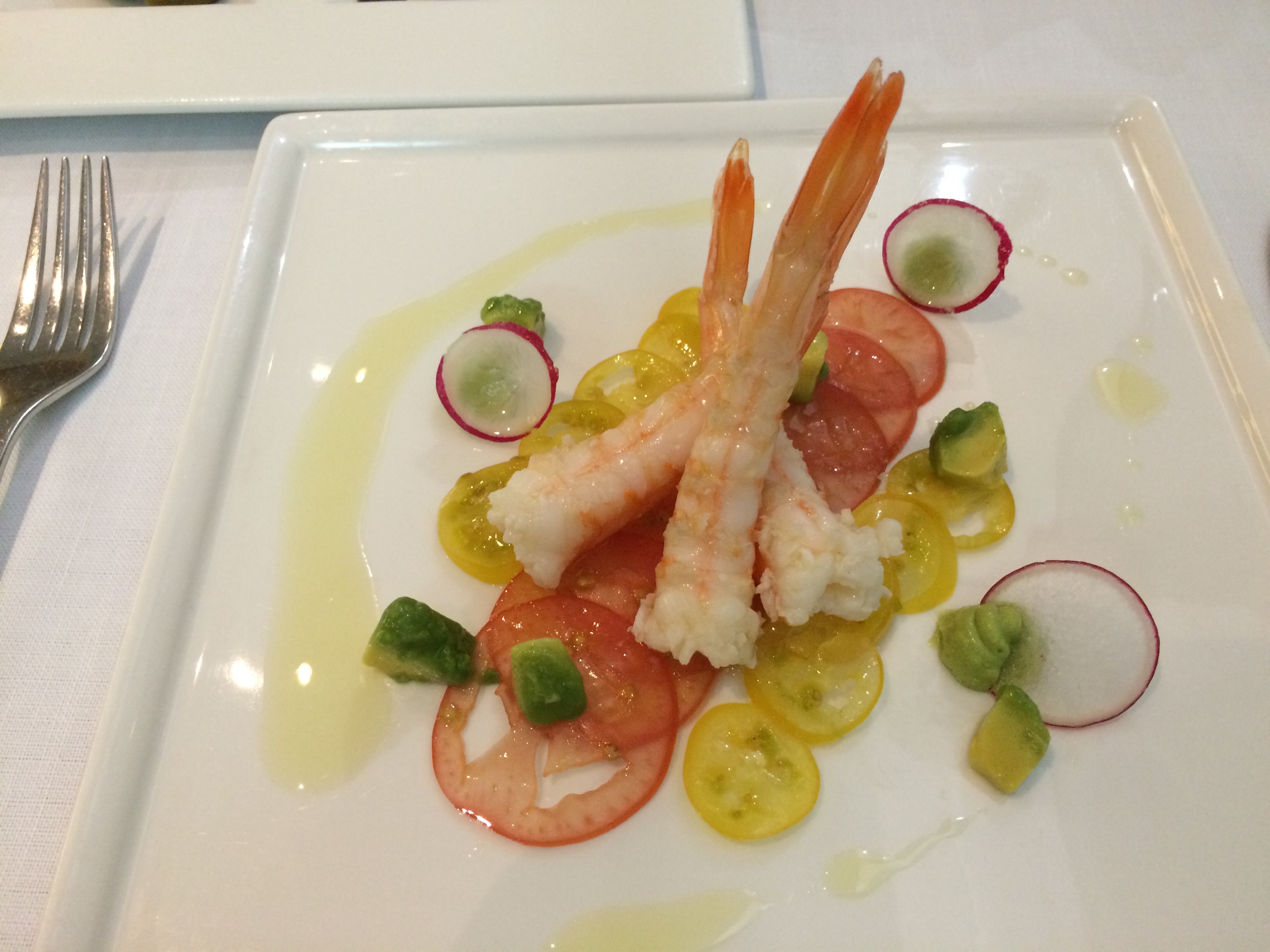 I made my way to the dining room. Though they have min-buffets every few gates, and the food there looked great, I wanted to try out the dining room, since they had a menu too. In either case the min-buffets or here you had a large self-service are plus full bar with many choices. I was currently on an all Voss water diet so that’s all I consumed. The waiter was slightly shocked when I said I’d pass on wine.