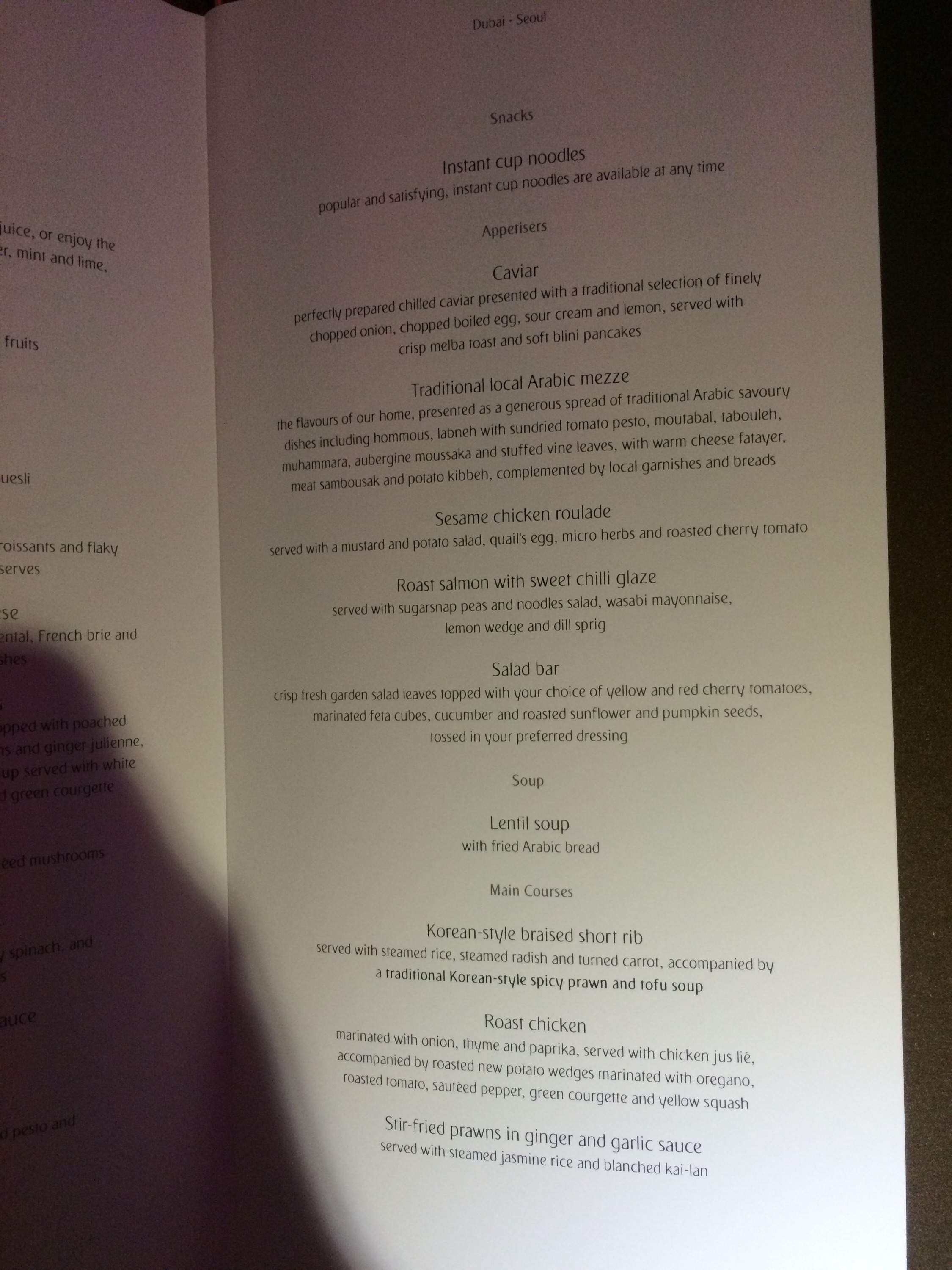I had a good flight overall, but I had to say that the staff on this flight was 2 1/2 if the last flight was 5 stars. Why do I say this? Service and service alone. I had a really difficult time communicating with the staff. During the pre-flight introductions, the pilot was proud to mention that 15 different languages were spoken by the crew. The problem was that the crew working first spoke English just not that well. Now I don’t speak Arabic or Korean so do I expect perfection? No. But I do expect to be able to communicate, and that was really tough. A 100% difference then the flight from the US. This really surprised me for a global airline, and one that’s growing at an exponential rate. For example when I was ordering my meal, I had to point at every item I wanted sine the person taking orders could not understand me. Same went for ordering drinks too. Again this is a slightly minor issue, but it was just annoying that I could not communicate that well with the crew. Would this prevent me from flying Emirates ever again? No. This was my fourth flight ever on EK, and the first time this happened.