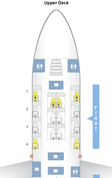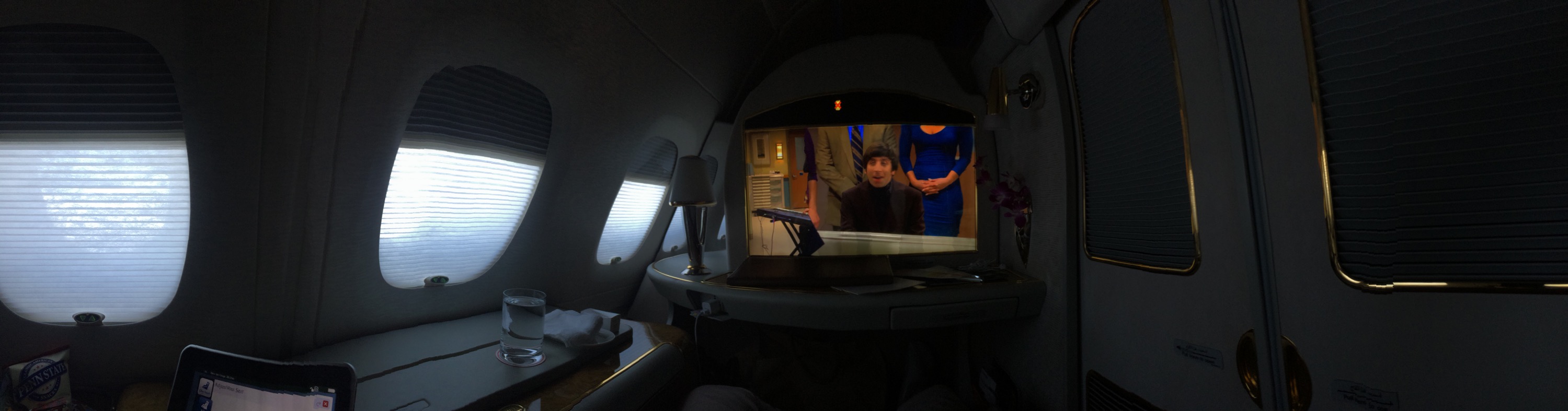 After about a seven hour layover in Dubai in their glorious terminal three lounge I headed for the plane. When departing from T-3 in first class you have the opportunity of boarding from it. There are gates on the fourth level in the lounge, once your boarding pass is scanned you take an elevator down two levels and walk to your plane. The only other people on this level are other guests heading to their flights also in first. Once you make your way to your plane you board on the upper deck turn left and head to your seat. You know you’re living the good life!!