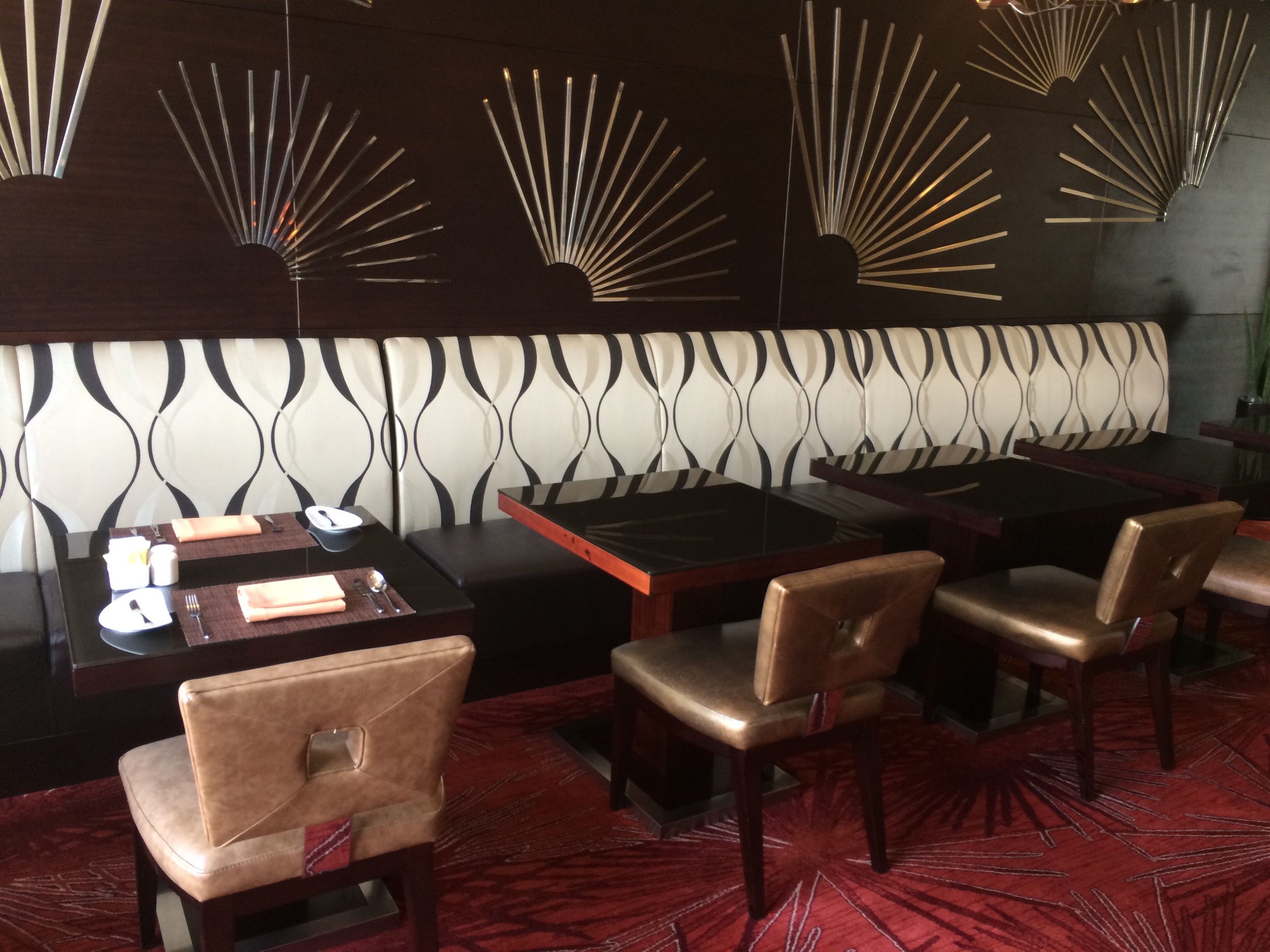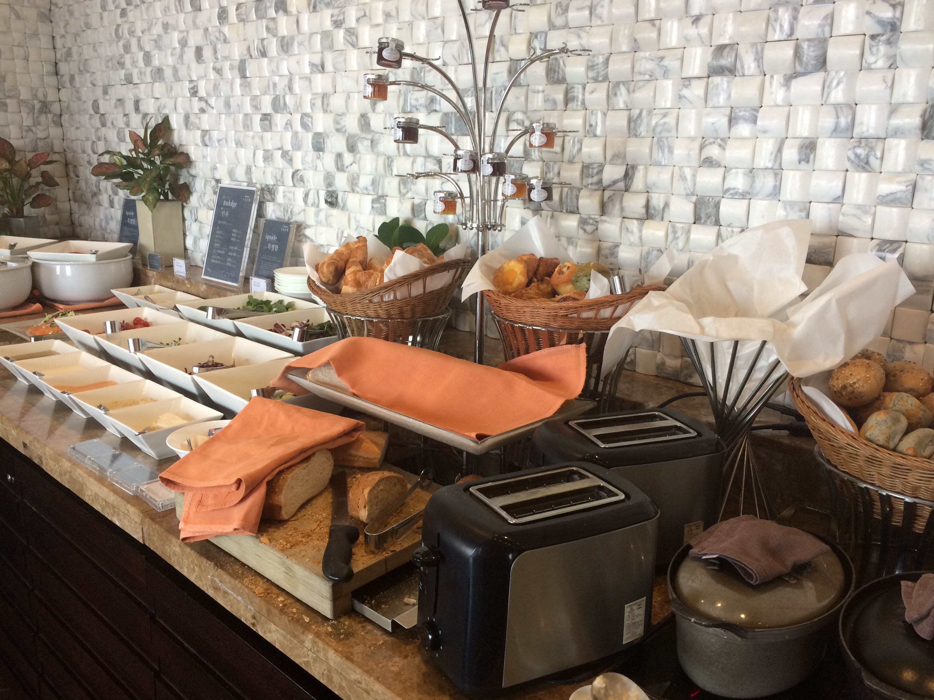 In the morning, I headed up to the lounge for breakfast, and I was immediately taken back by the beauty of the marble wall in the kitchen area. It was a stunning basket weave design and I’d kill to have it on my kitchen backsplash. The meal spread was pretty good too, not as extensive as I’ve had at other hotels in Asia, but it was good. In this case, they had breads, salads, soups, eggs, bacon, cereals and juices. They didn’t offer made to order meals, but again that was ok. Besides the ample seating and again a really nice view of Songdo and the park, they also had a few workstations and a printer plus a concierge to assist in other matters.
