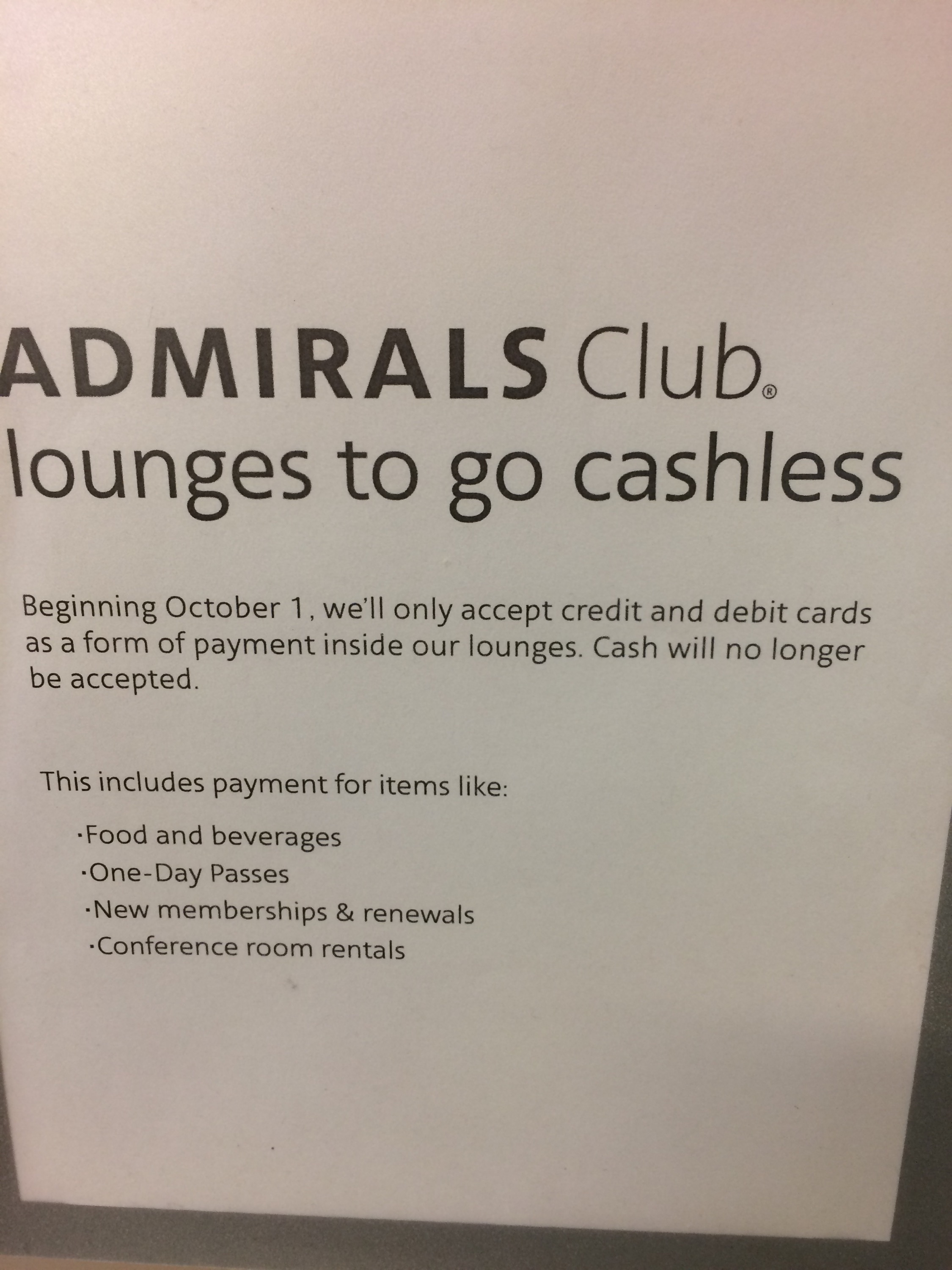Well it looks like American Airlines Admirals Clubs will go cashless as of October 1st. I was at the St. Louis location this week and saw this sign in a couple different spots in the lounge. I can’t say I’m surprised, it’ll probably make reconciling nightly cash and monies from the bar and day passes way easier. I can’t imagine that the clubs bring in that much cash on a daily basis, and having to balance those funds has got to be a pain the butt.