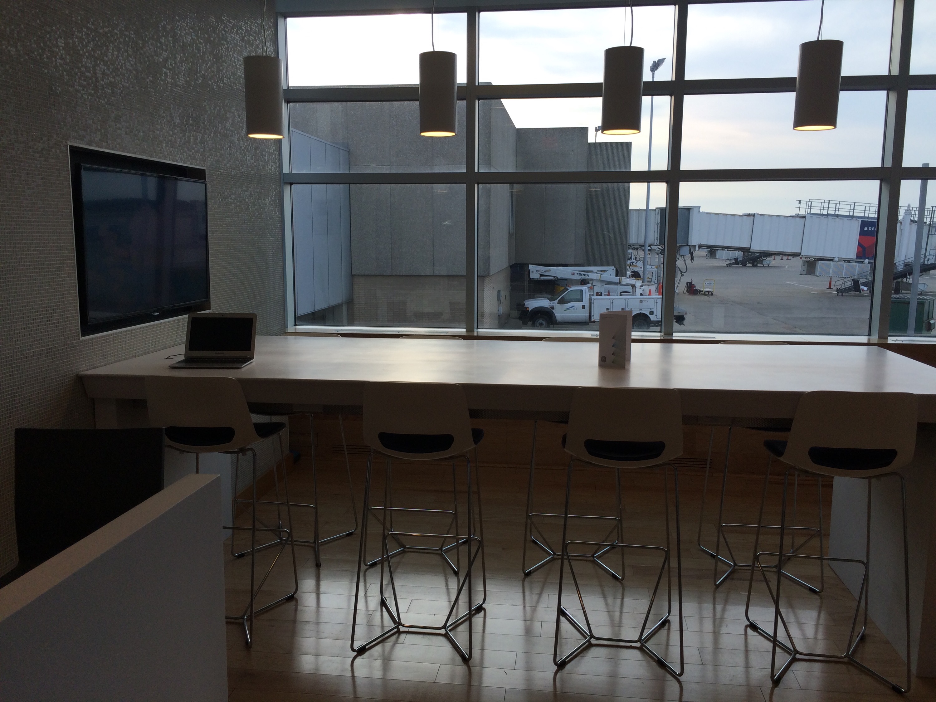 The Airspace Lounge was small, maybe seating for 30. It consisted of three separate seating areas one that was ¾ enclosed plus a bar area and then another high top common table. There was also a large bank of windows on two sides that gave nice views of the tarmac and gates. They offered complimentary sodas, juices, coffee, tea and pretzels. They might have even had free booze, but I didn’t ask and wasn’t thirsty for a beer, I must have been sick or not feeling well I guess.