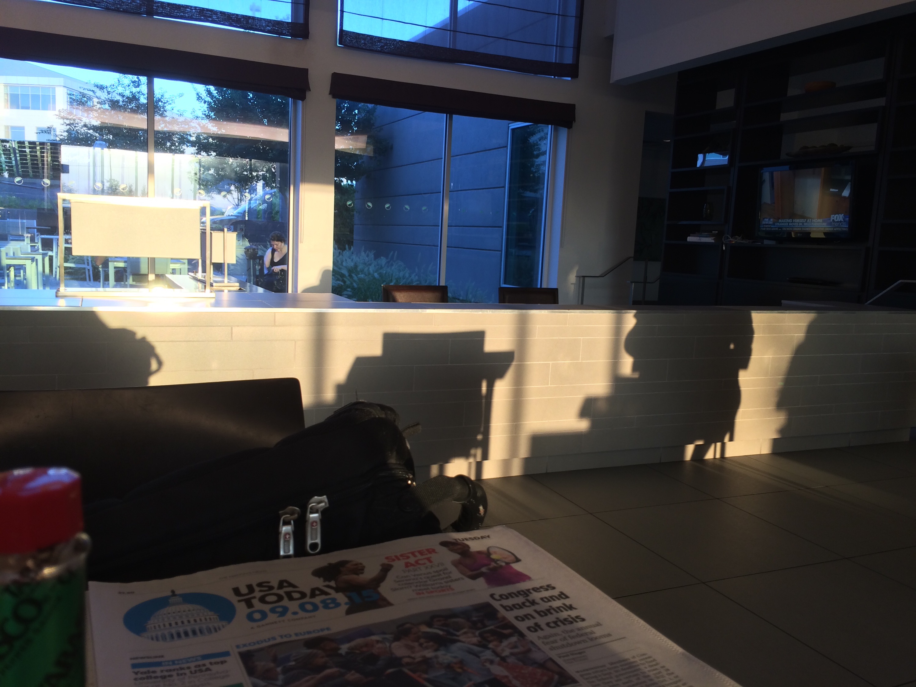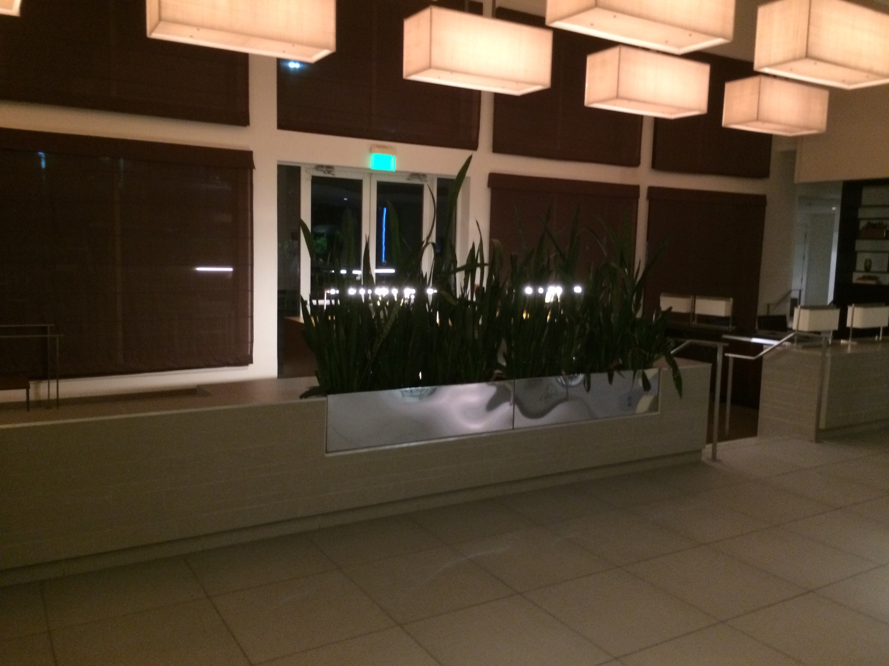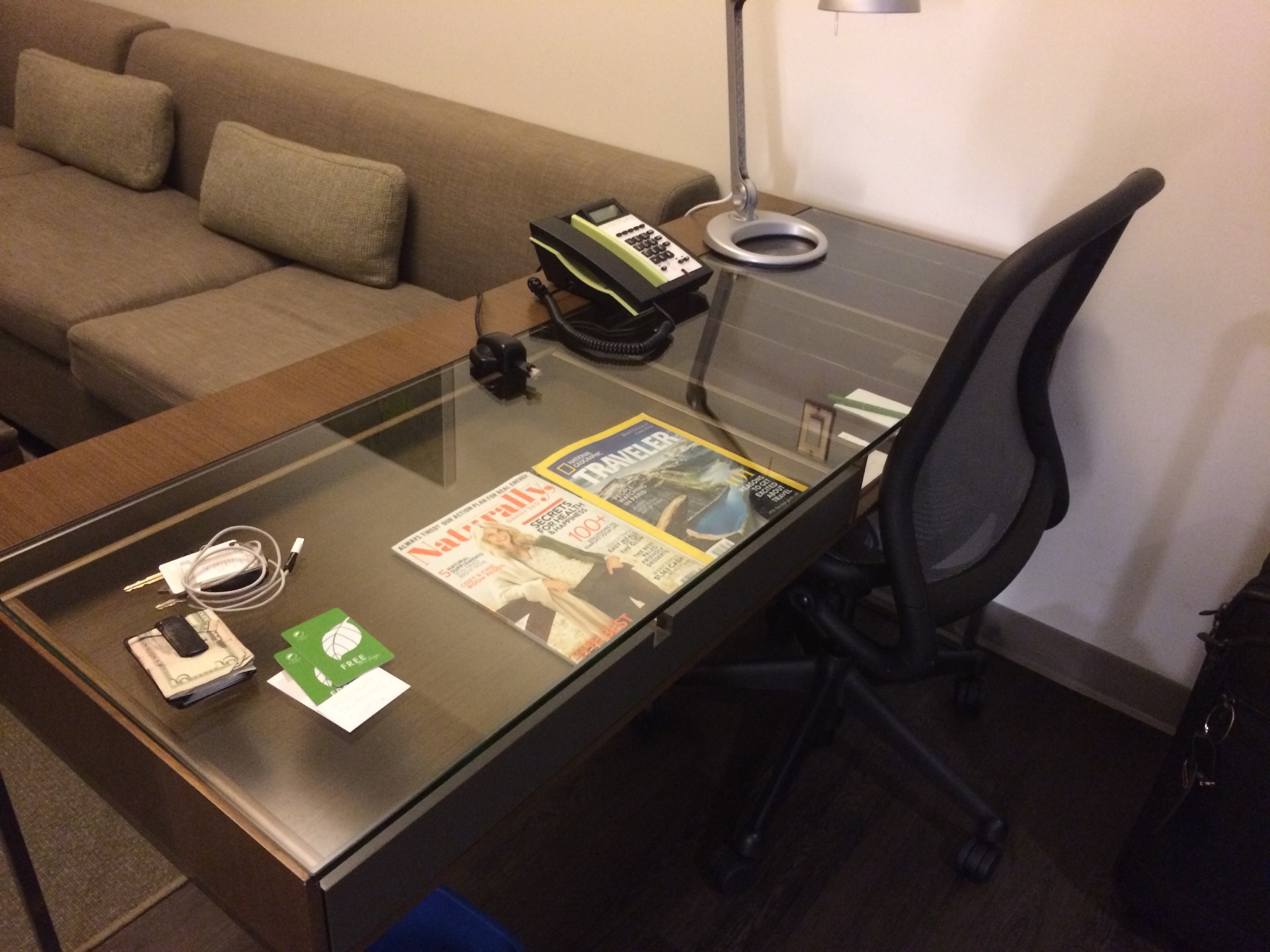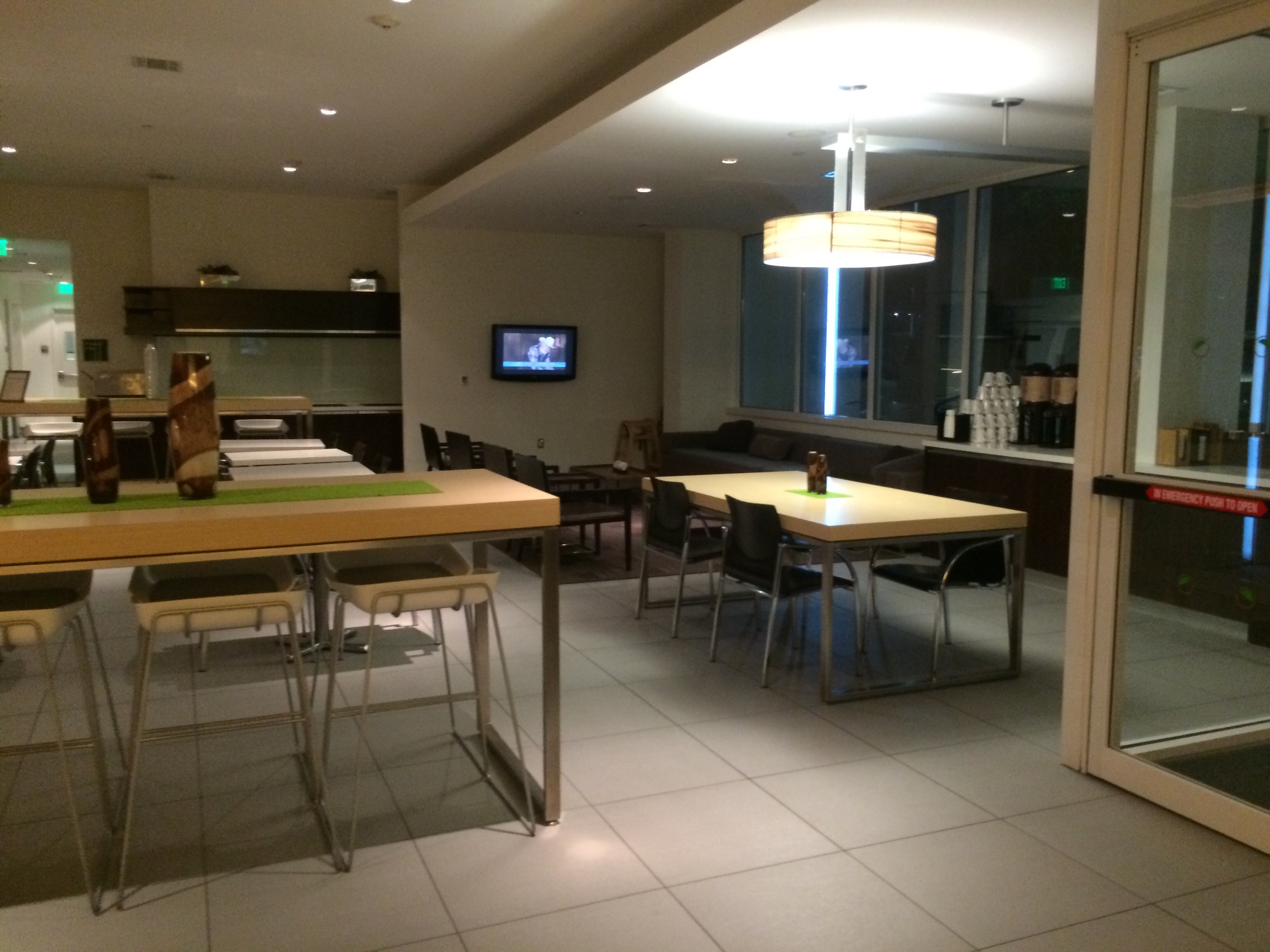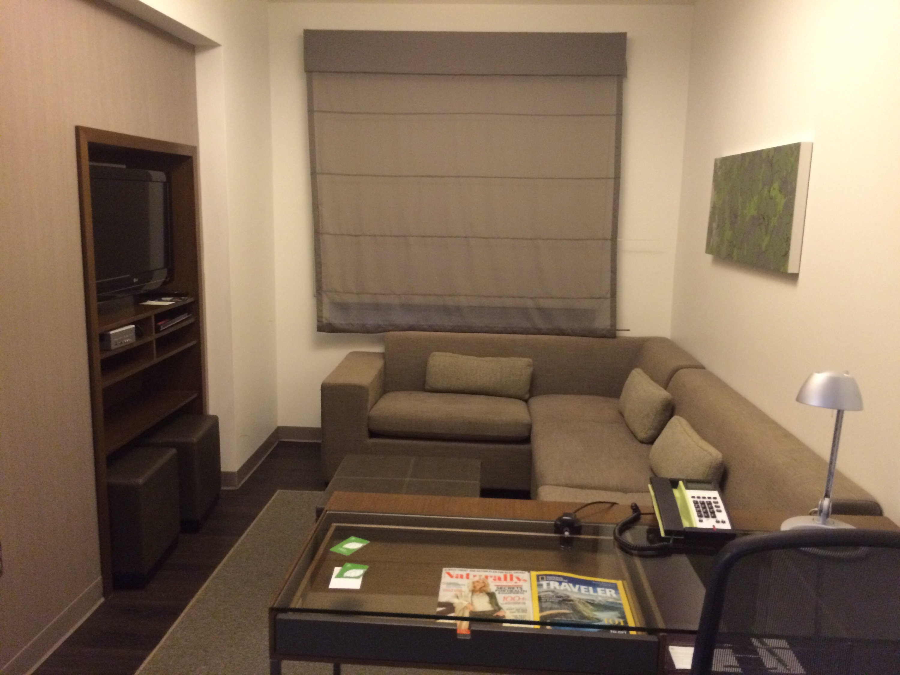 The lobby was very modern and homey at the same time. It had three or four sitting areas inside and one outside plus an indoor fireplace to hang out at. I found the space to be welcoming and inviting. Over the past few years the hotel brands I frequent (Hilton, SPG and Hyatt) have really tried to up there game in the Lifestyle category, and hotels like this are ones I will now look forward to staying at. Between Hilton’s Canopy, Curio and Home2Suites Hyatt’s Hyatt Place, House and Andaz and finally SPG’s W, Element and aLoft there are a lot of new(er) brands to try and lots of similarities and differences between them. Can I call this exciting times in the hotel industry? No. But definitely a time of lots of new hotels which means that wonderful new car smell when walking in the door. Plus with the hotel taking a thoughtful approach to how the hotel was built and what products they use in the hotel makes some of us feel good too. From Energy Star Appliances, to glass and metal dish wear and Low VOC paints, plus flooring that’s up to 100% recycled. It’s a nice touch.