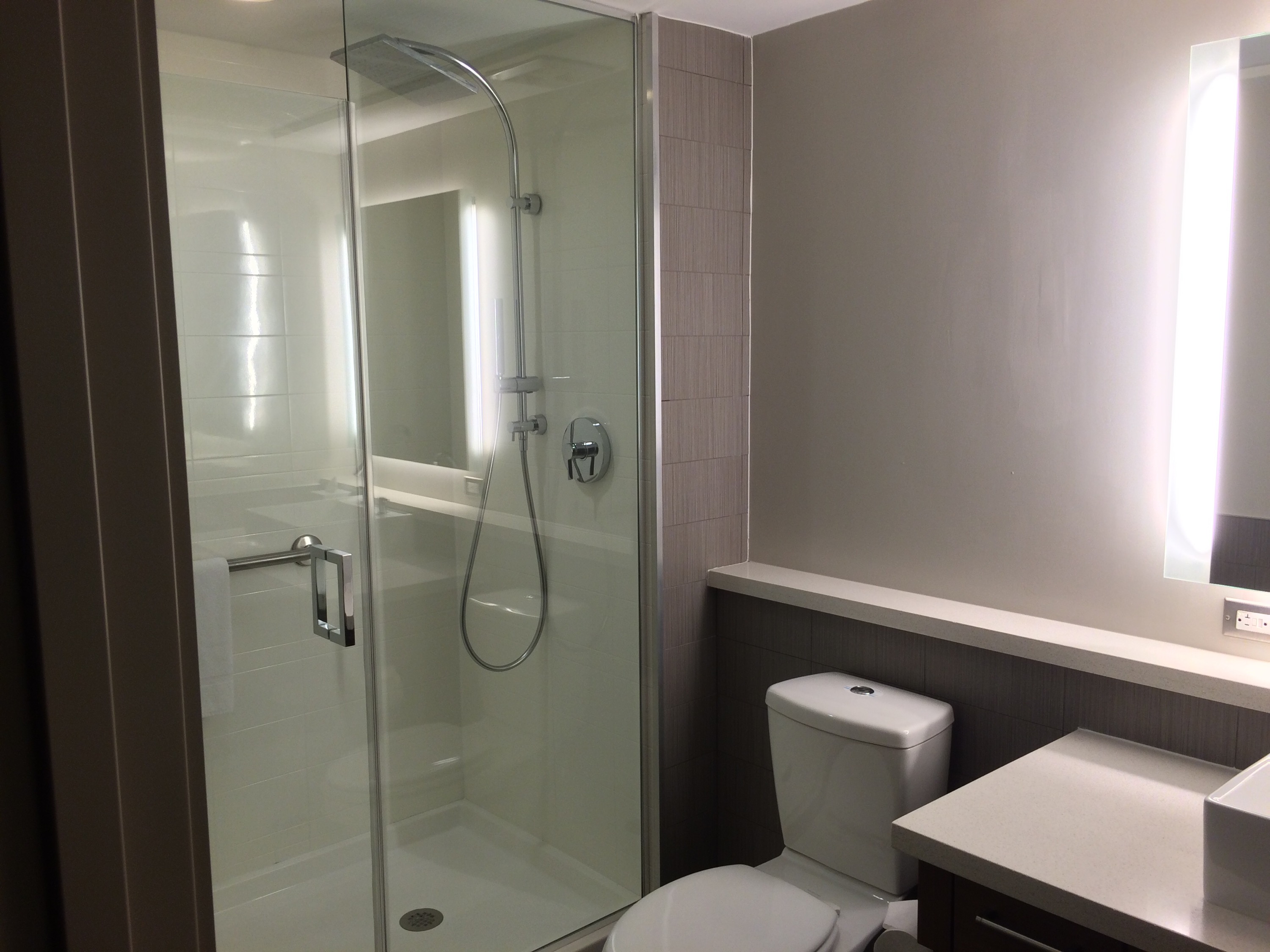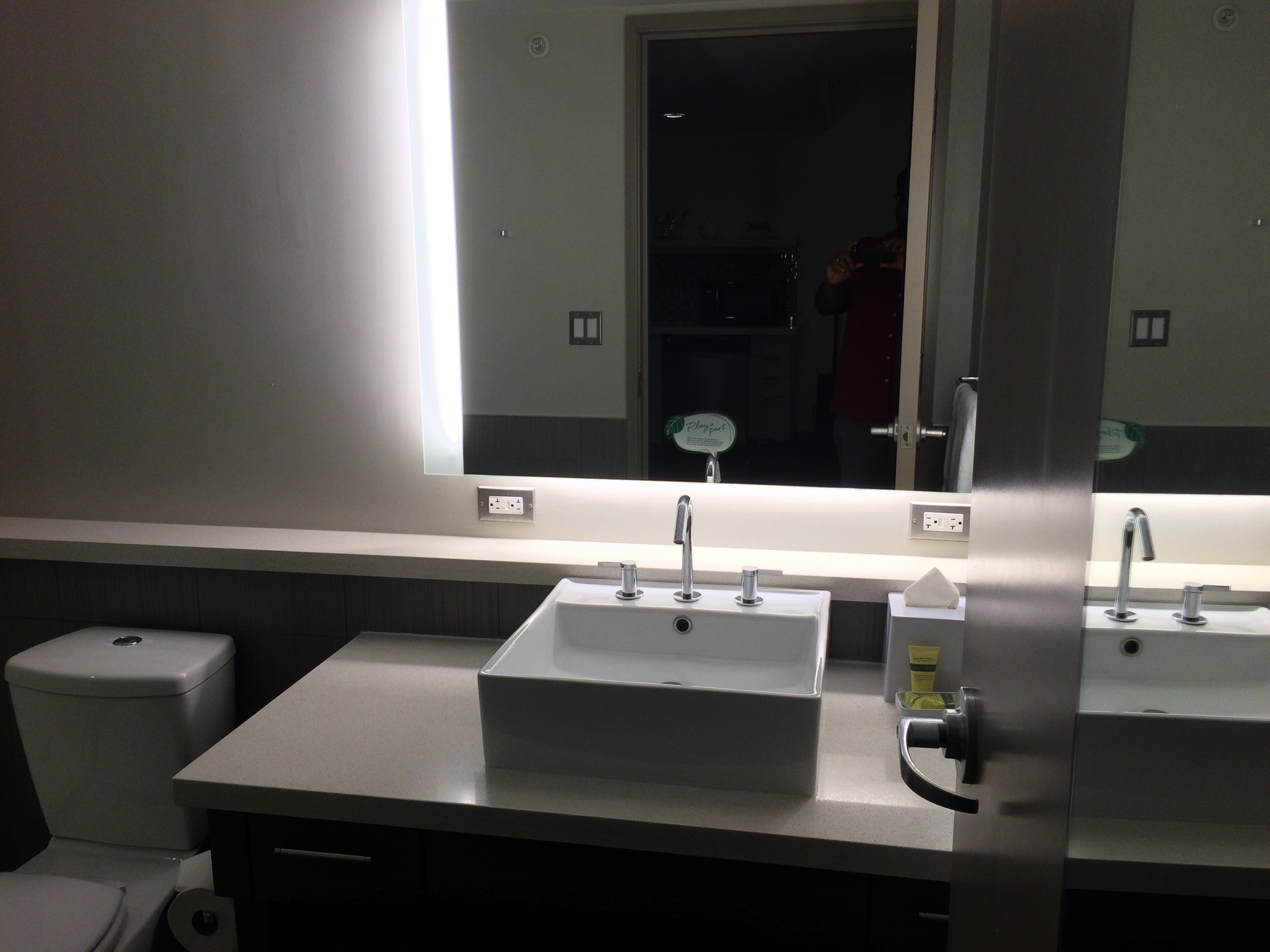 The bathroom like the rest of the room was very clean and modern. I appreciate the nice touches like the above counter sink and goose neck faucet. Plus the very very large rain shower. Elements and features that are not at your usual Doubletree or Sheraton.
